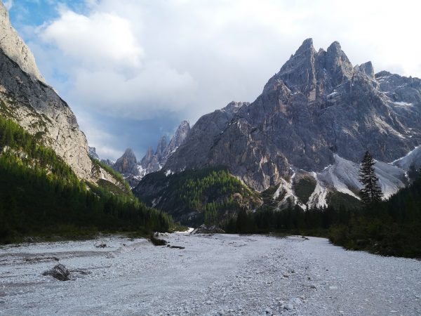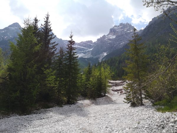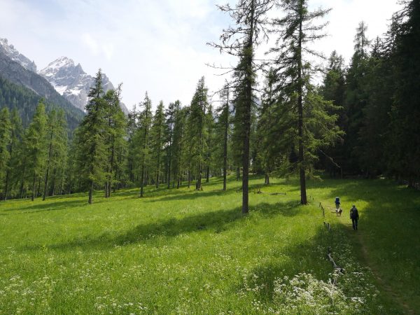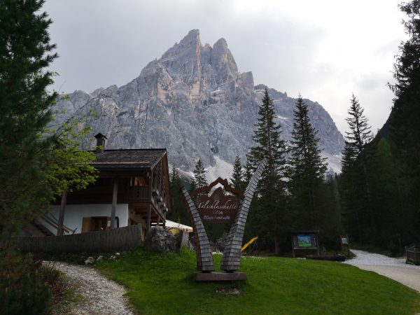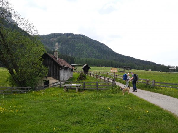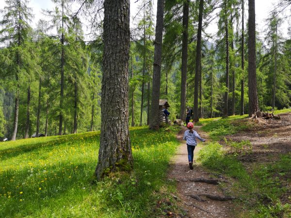 Weiter geht`s bergan durch den Wald, vorbei an noch mehr Infotafeln. Wenig später steigt der Weg steil an. Wir biegen jedoch links ab Richtung Fischleinboden-Hütte (1a). Kurz darauf verlässt der Weg den Wald. Der schönste Teil der Strecke beginnt. Wir finden uns auf einem schmalen Pfad wieder, dem wir durch Wiesen mit Lärchen und Dolomitenblick folgen. Schließlich erreichen wir den Fischleinboden mit gleichnamiger Hütte, Hotels und großem Parkplatz. Wir laufen weiter geradeaus ins Tal hinein, zunächst auf einem Teersträßchen, schließlich auf einem Schotterweg, der uns entlang eines großen Geröllstroms tief hinein ins Tal und zu den Felswänden führt. Pause an der Talschlusshütte. Hier erwartet uns Südtiroler Küche mit regionalen Zutaten auf der großen Sonnenterrasse, ein großer Spielplatz und ein Traumblick.