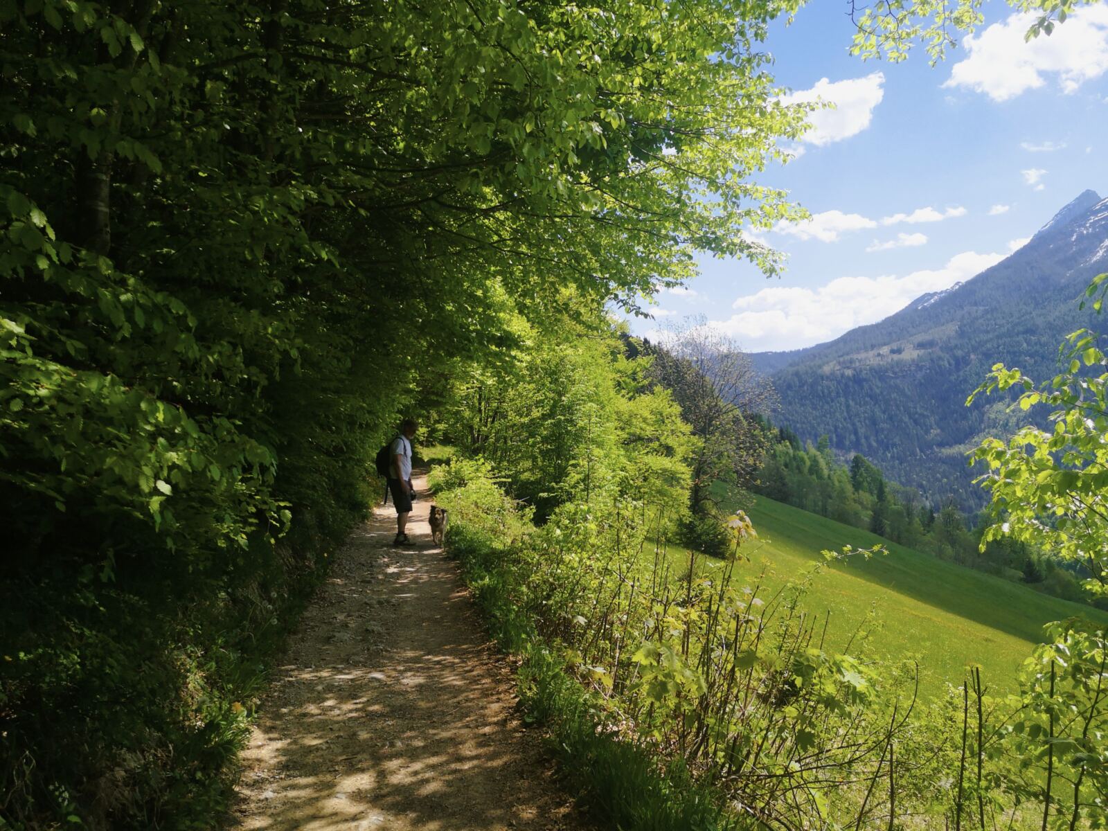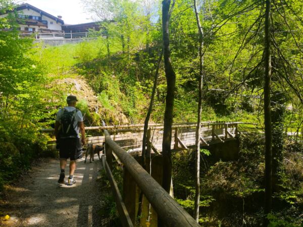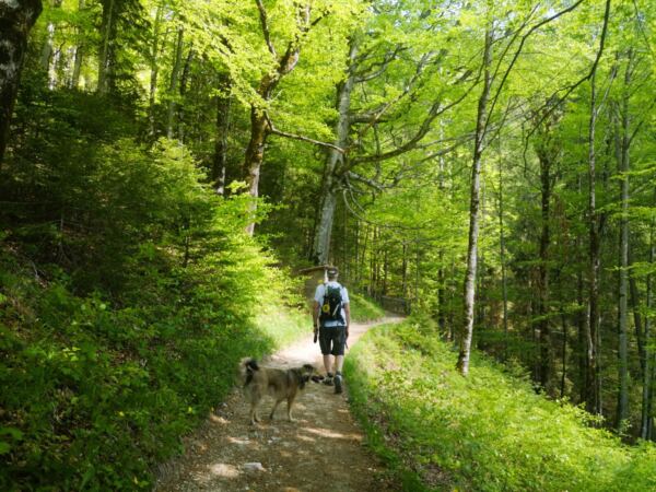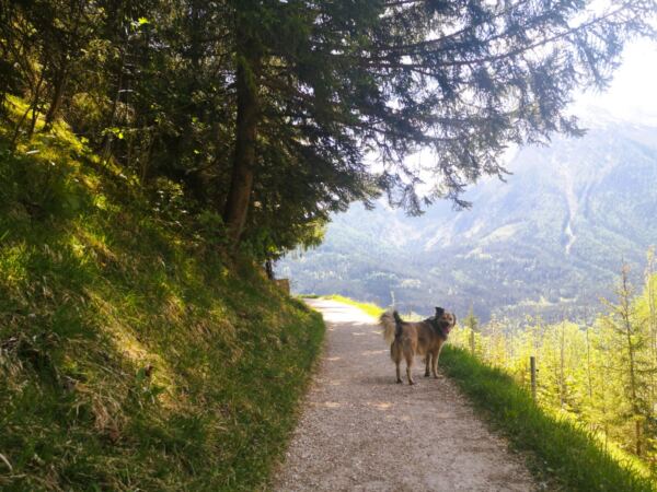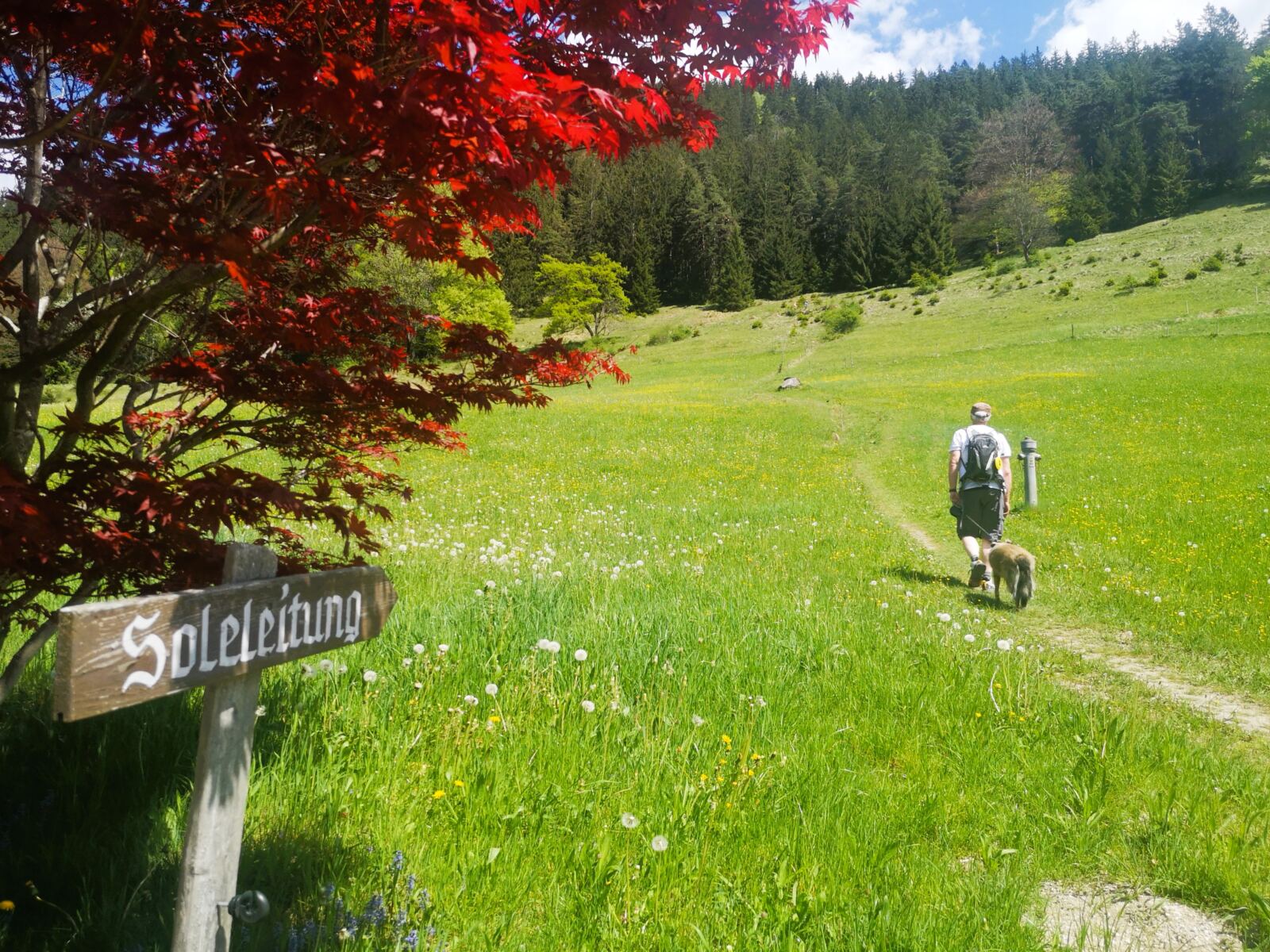 Der Weg verläuft weitgehend eben. Zwei Abschnitte – kurz vor dem Start und kurz vor dem Ende – führen uns steil bergauf bzw. bergab. Wir laufen auf gut ausgebauten Wanderwegen, Wald- und Wiesenpfaden, kurze Abschnitte auf Asphalt. Sonne und Schatten wechseln sich ab. An der Ache kann unser Hund immer wieder abtauchen. Auch auf dem Soleleitungsweg treffen wir hier und da auf einen Wasserlauf. An heißen Tagen solltet ihr dennoch Extra-Wasser für den Wauzi mitnehmen. An sonnigen Wochenenden solltet ihr besser früher starten. Sonst kann’s stellenweise etwas trubeliger werden.