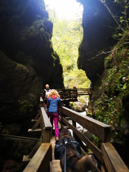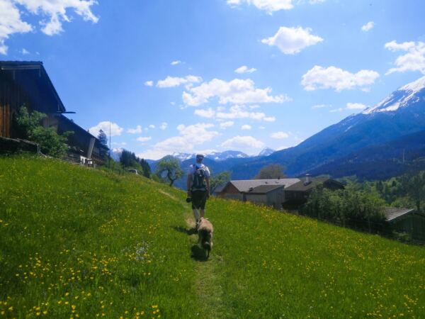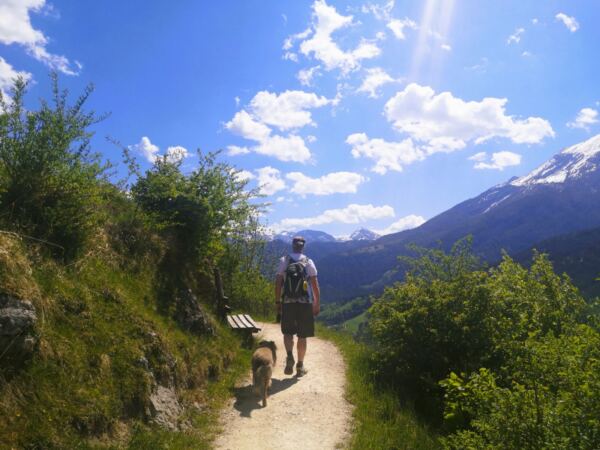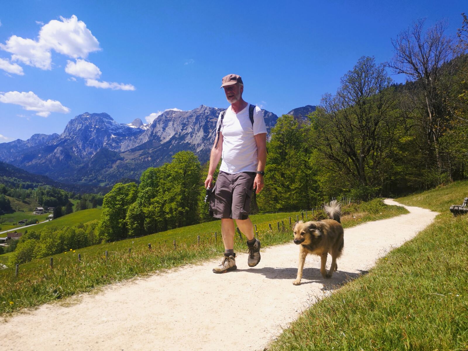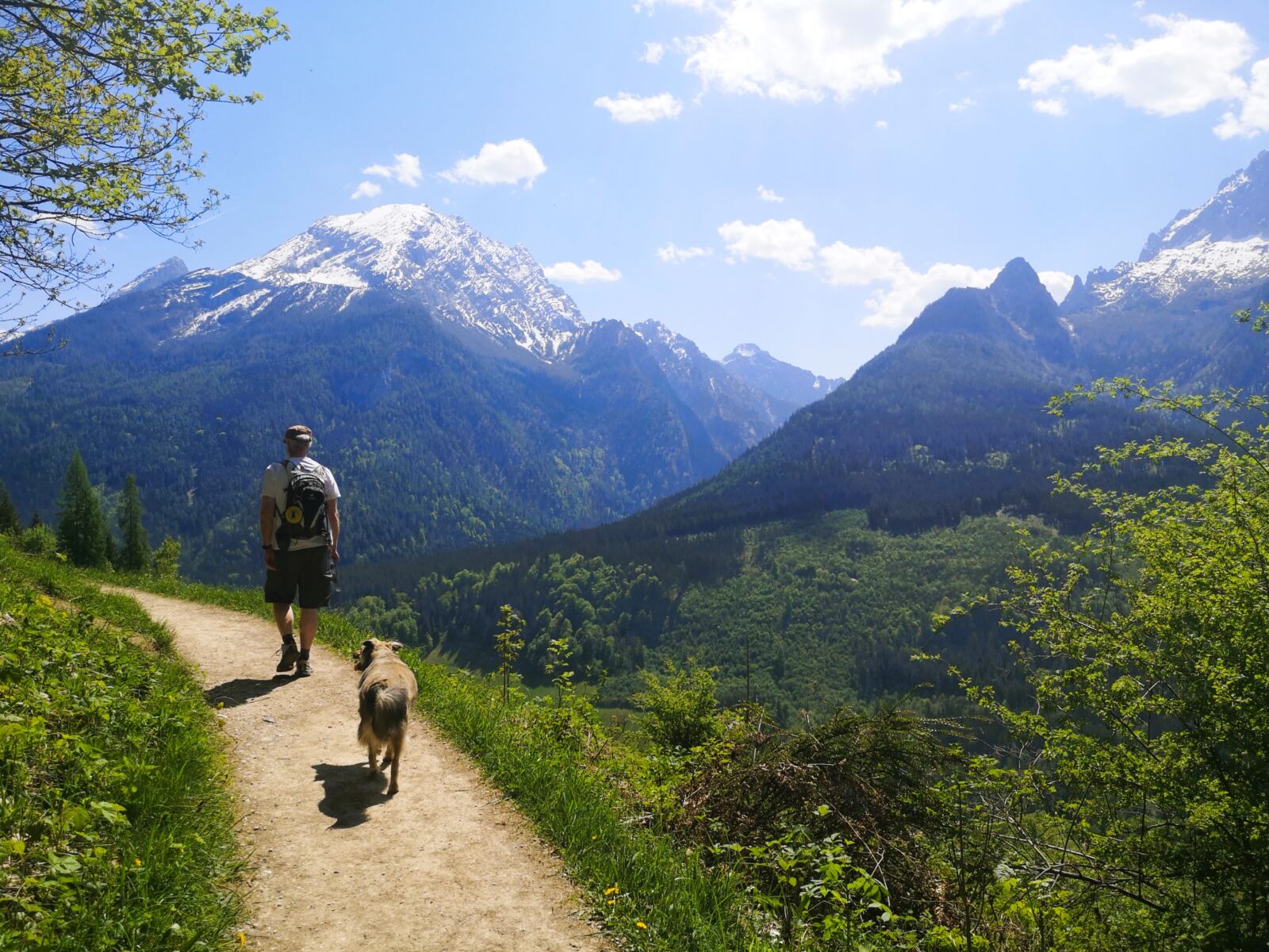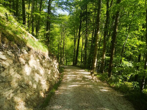 Der Weg verläuft weitgehend eben. Zwei Abschnitte – kurz vor dem Start und kurz vor dem Ende – führen uns steil bergauf bzw. bergab. Wir laufen auf gut ausgebauten Wanderwegen, Wald- und Wiesenpfaden, kurze Abschnitte auf Asphalt. Sonne und Schatten wechseln sich ab. An der Ache kann unser Hund immer wieder abtauchen. Auch auf dem Soleleitungsweg treffen wir hier und da auf einen Wasserlauf. An heißen Tagen solltet ihr dennoch Extra-Wasser für den Wauzi mitnehmen. An sonnigen Wochenenden solltet ihr besser früher starten. Sonst kann’s stellenweise etwas trubeliger werden.