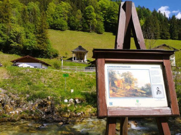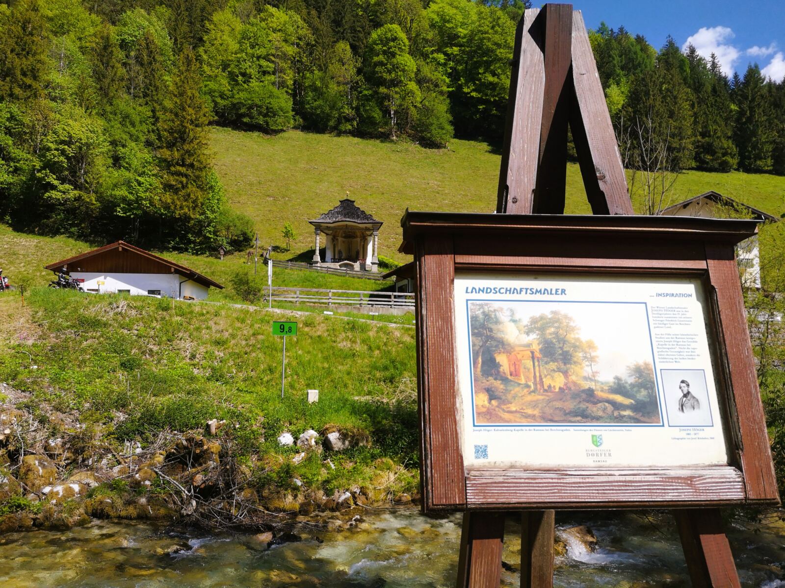 Am Ausgangspunkt unserer Tour laufen wir erst einmal an der Ramsauer Ache entlang. Die Landschaft hier hat viele Maler inspiriert. Gegenüber sehen wir schon unseren Wanderweg mit der Kalvarienbergkapelle.