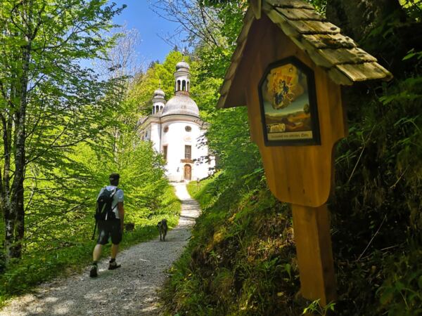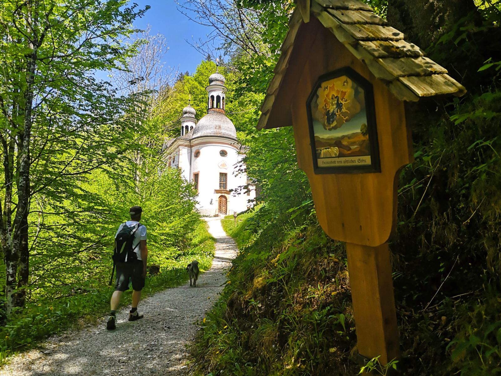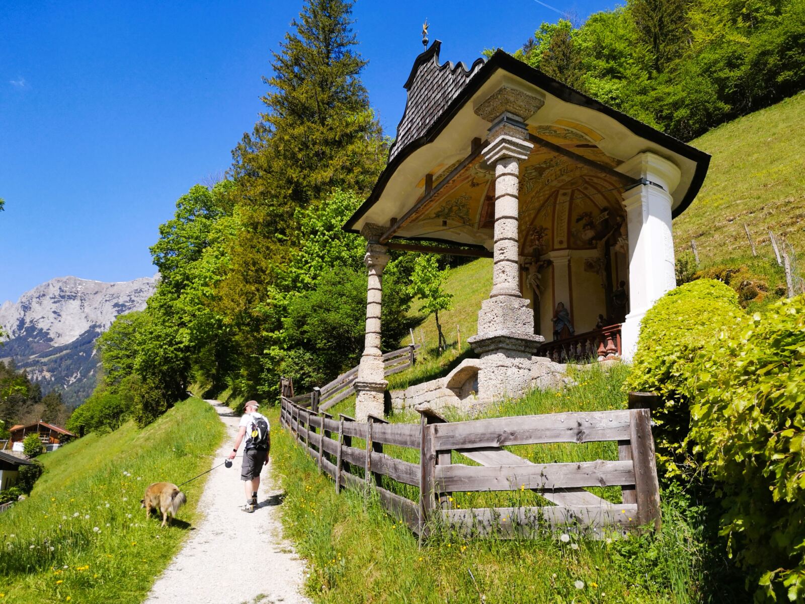 Wir beginnen unsere Tour am Wanderparkplatz Pfeiffermacherbrücke. Von hier aus folgen wir dem Wanderweg entlang der Ramsauer Ache flussabwärts, der Fluss links von uns. Nach kurzer Zeit überqueren wir eine Brücke und gelangen zur Durchgangsstraße „Im Tal“, die wir vorsichtig überqueren. Wir folgen dem Wanderweg recht steil bergauf, vorbei am ersten Hingucker: der Kalvarienbergkapelle. Die Kapelle, mehr ein offener Altar, präsentiert sich üppig und bonbonbunt im Stil des späten Rokoko, erbaut 1774. Sie markiert den Beginn des Kreuzwegs zur Wallfahrtskirche Maria Kunterweg.