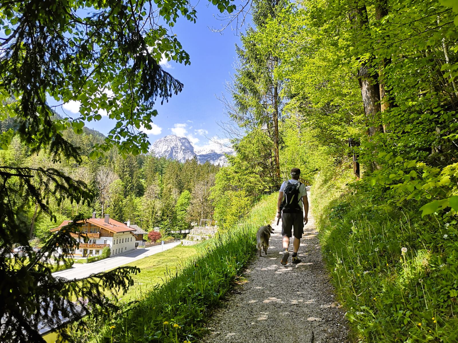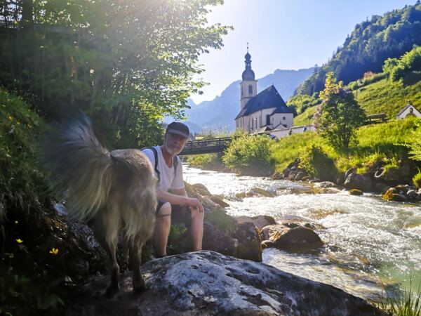 Das Bergsteigerdorf Ramsau vereint wohl alles, was man sich unter einem Postkarten-typischen Ort in Oberbayern vorstellt: glasklare Bäche, Bauernhöfe, Zuckerbäckerkirchen mit dickem Zwiebelturm, traditionsreiche Gasthäuser. Und das alles vor einer beindruckenden Bergkulisse inklusive Hochkalter und Watzmann-Massiv. Wer den Ort nur von Bildern kennt, könnte glatt glauben, hier hätte wer mit Photoshop nachgeholfen. Tatsächlich ist alles in natura noch schöner. 😊⛰️ Die volle Ladung Oberbayern-Pracht lässt sich auf dieser Rundwanderung mit Hund entdecken. Sie führt uns an der Ramsauer Ache entlang zur Wallfahrtskirche Maria Kunterweg. Weiter geht`s mit herrlichem Weitblick auf dem Soleleitungsweg, auf dem einst die Sole zur Salzgewinnung von Berchtesgaden nach Reichenhall transportiert wurde. Unterwegs kehren wir in Bergasthöfen ein und kommen schließlich noch an einem Insta-Spot vorbei: die Pfarrkirche St. Sebastian. Ihre Lage am Bach mit Holzbrücke im Vordergrund und dem Watzmann dahinter hat sie zur meistfotografierten Kirche Deutschlands gemacht.