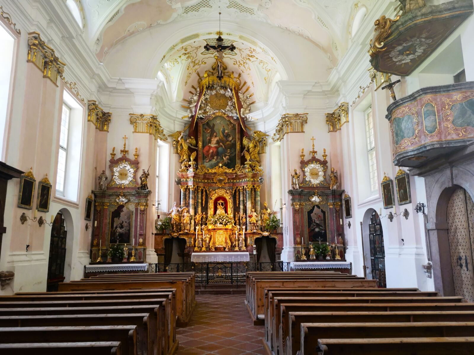 Wir laufen weiter durch lichten Wald und gewinnen schnell an Höhe. Wenig später erreichen wir die Wallfahrtskirche Maria Himmelfahrt, auch bekannt als Maria Kunterweg, auch sie üppig im Rokokostil und noch älter als ihre Vorhut am Beginn des Wegs. Hineinschauen lohnt sich.