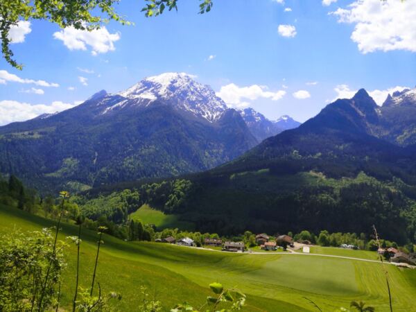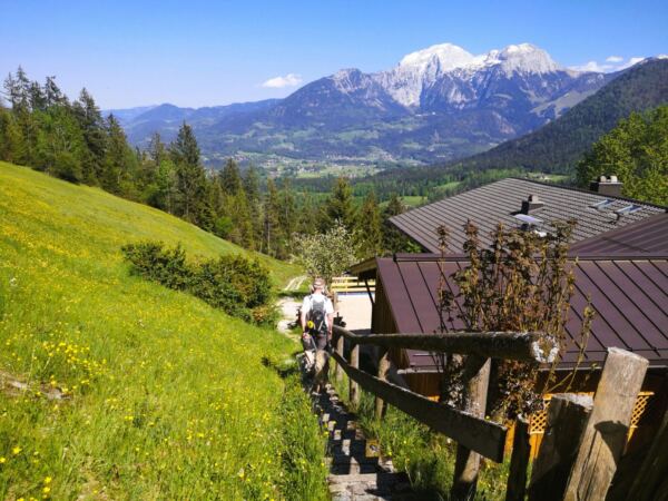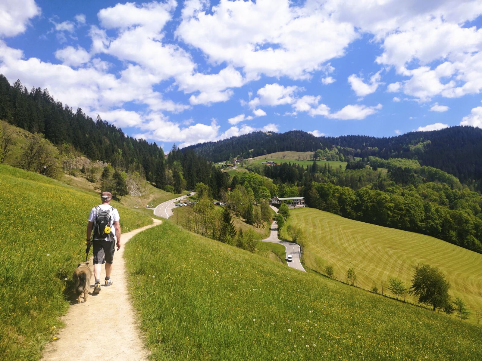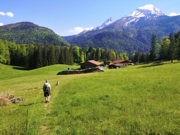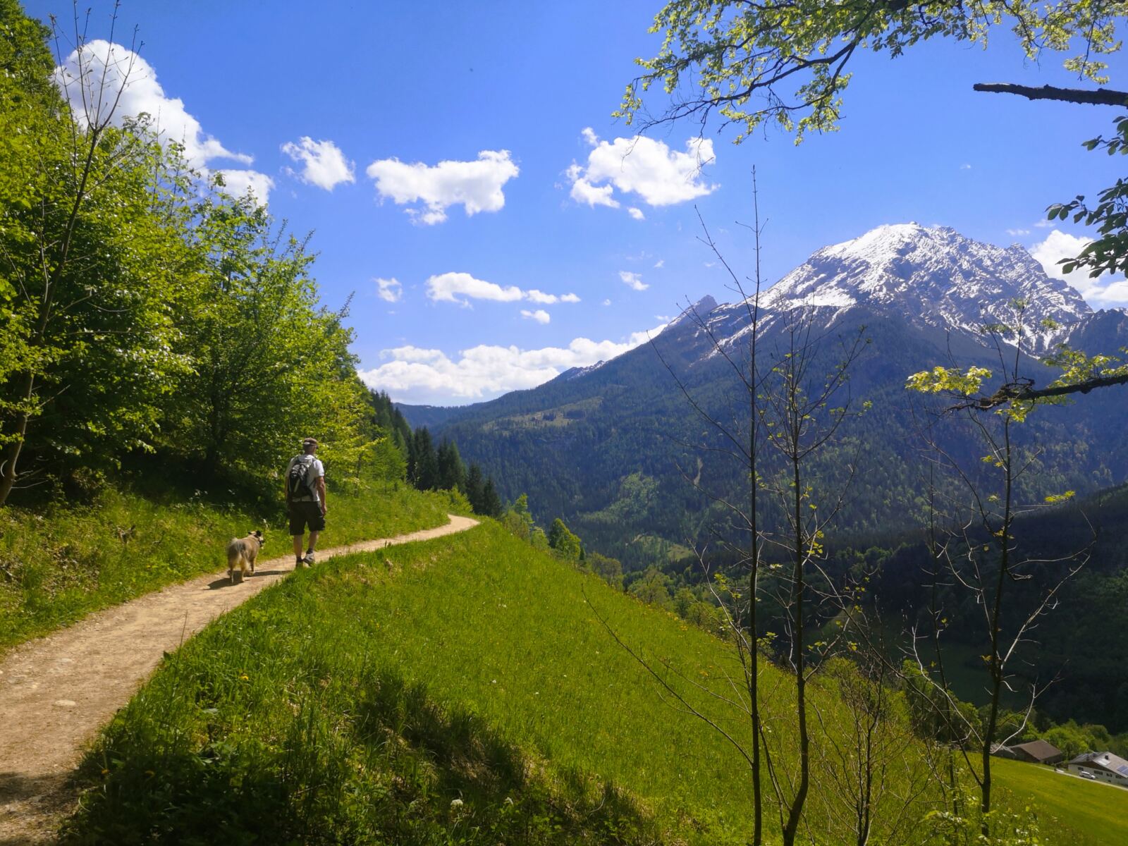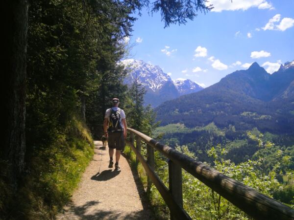 Wir laufen vorbei am Gasthof Hindenburglinde. Dahinter biegt der Wanderweg von der Alpenstraße ab. Er führt uns zunächst parallel zur Alpenstraße über eine Wiese, dann zwischen Hofgebäuden bergauf. Dahinter geht es wieder über eine Wiese mit Wegweiser Soleleitungsweg. Unser Weg dreht nach rechts – und stößt schließlich auf den historischen Pfad, der bereits 1816/17 angelegt wurde. Wir folgen dem schönen Wanderweg an der Bergflanke entlang, um uns die Traumkulisse von Ramsau und den Berchtesgadener Alpen.