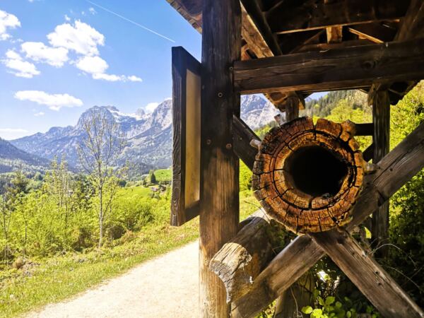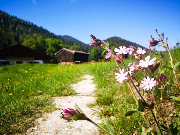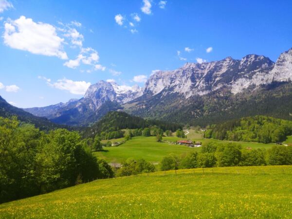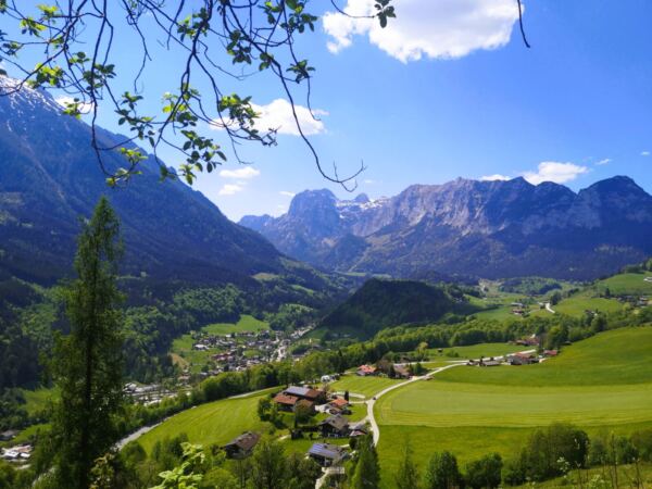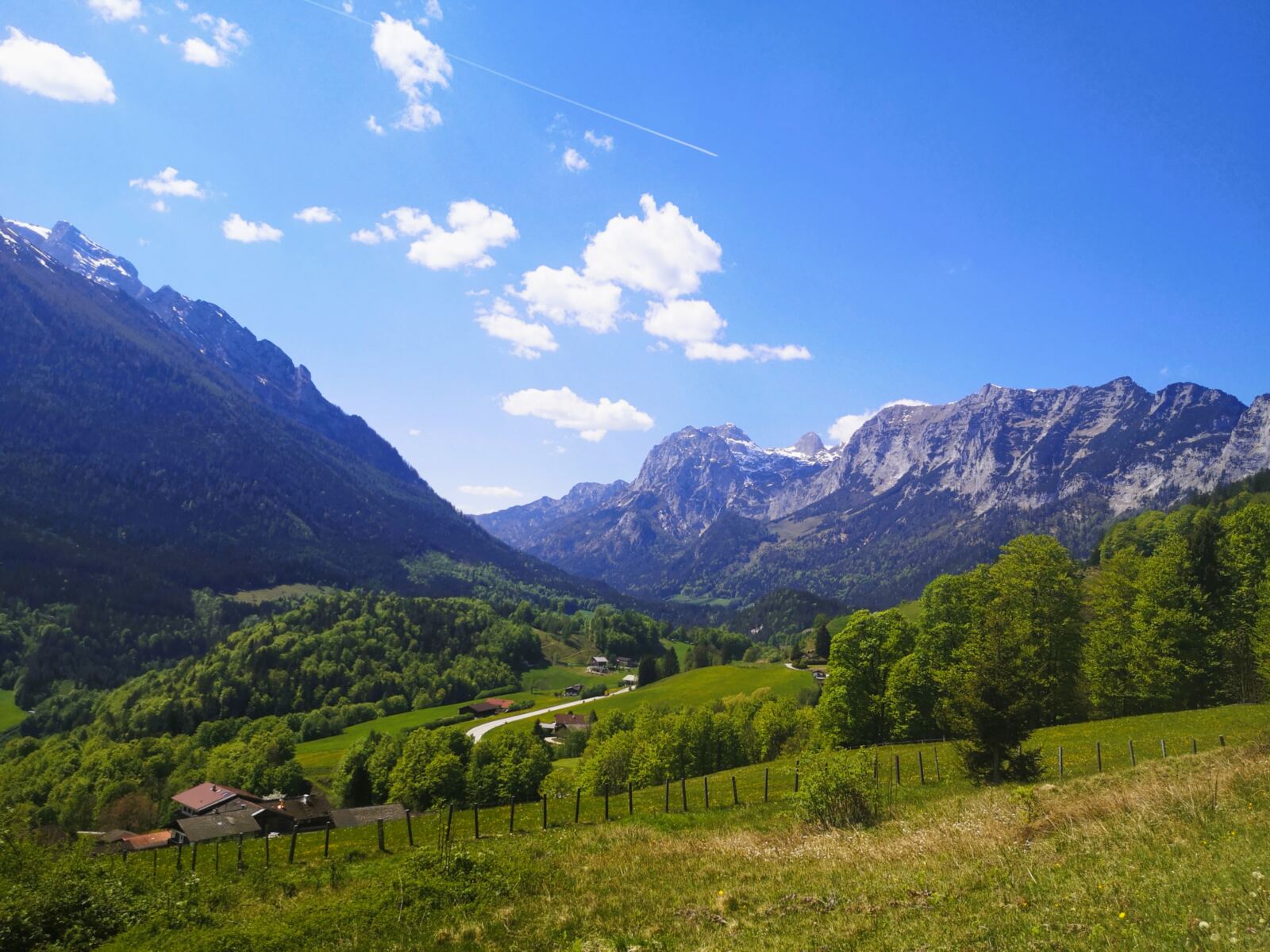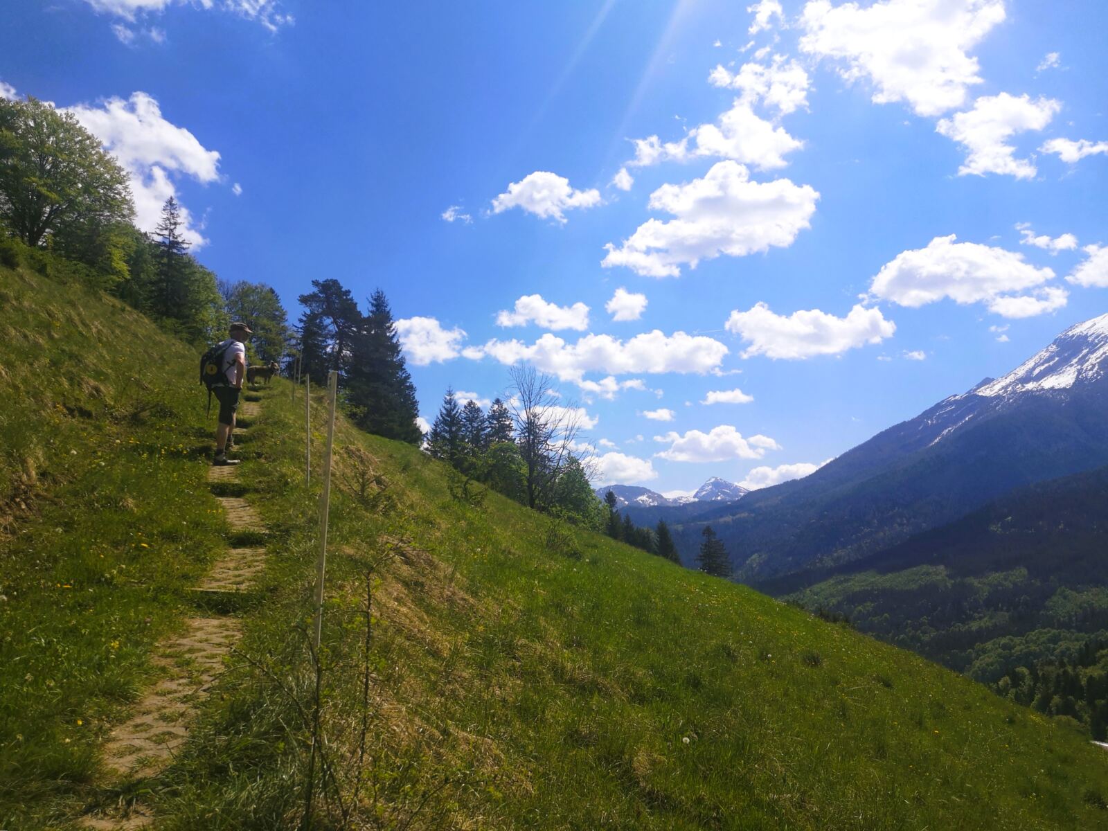 Wir laufen vorbei am Gasthof Hindenburglinde. Dahinter biegt der Wanderweg von der Alpenstraße ab. Er führt uns zunächst parallel zur Alpenstraße über eine Wiese, dann zwischen Hofgebäuden bergauf. Dahinter geht es wieder über eine Wiese mit Wegweiser Soleleitungsweg. Unser Weg dreht nach rechts – und stößt schließlich auf den historischen Pfad, der bereits 1816/17 angelegt wurde. Wir folgen dem schönen Wanderweg an der Bergflanke entlang, um uns die Traumkulisse von Ramsau und den Berchtesgadener Alpen.