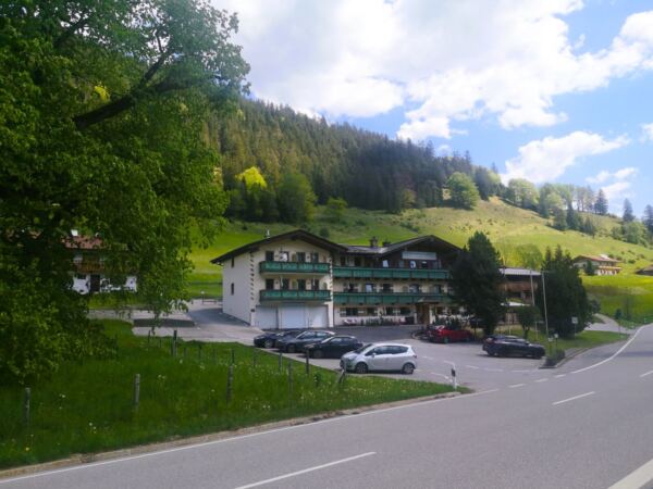 Der Soleleitungsweg bringt uns hinab zur Schwarzackerstraße, die wir überqueren. Auf der großen Terrasse des Gasthofs Zipfhäusl legen wir eine Pause ein.
