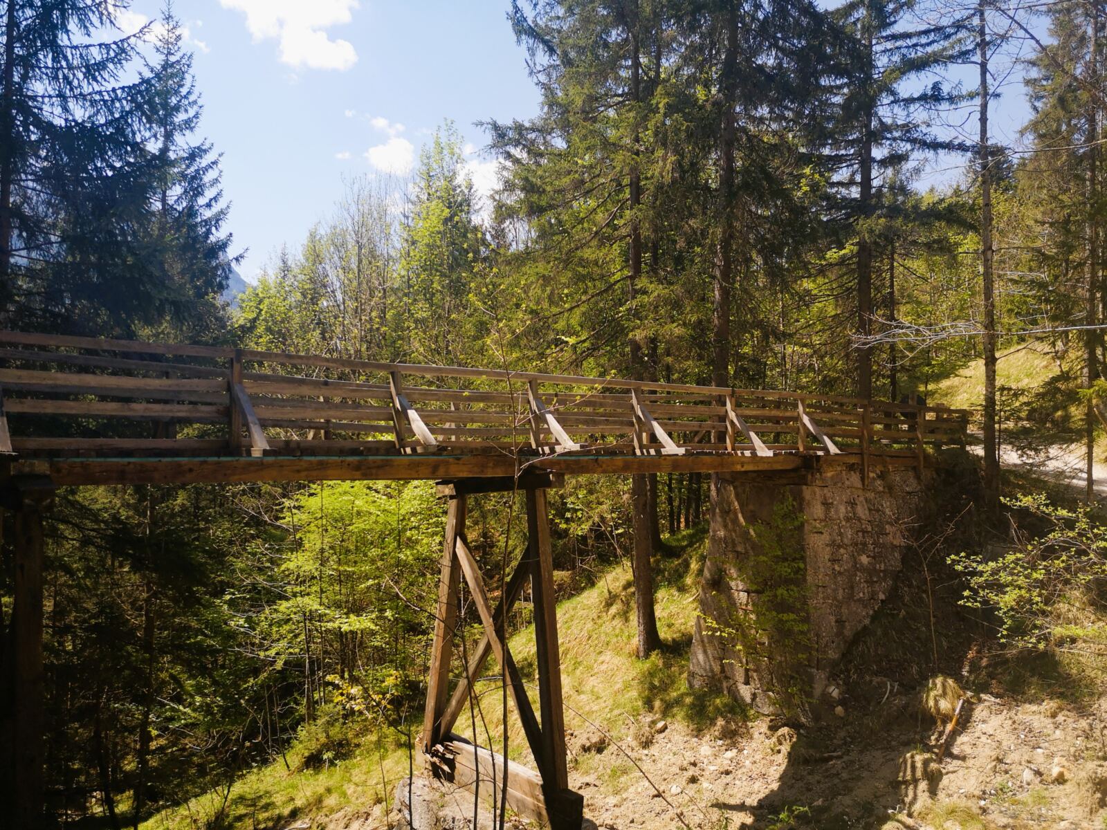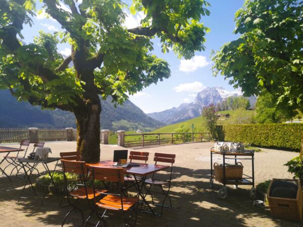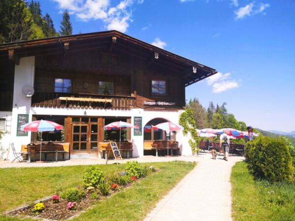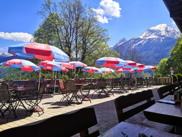 Weiter geht’s. Hinter dem Gasthof Zipfhäusl biegt der Soleleitungsweg rechts ab, führt uns über eine Brücke und in den Wald hinein. Wir folgen dem Wanderweg einfach immer weiter und genießen den herrlichen Ausblick. Schließlich erreichen wir den Berggasthof Gerstreit, der mit seinen rot-blauen Sonnenschirmen vor imposantem Bergpanorama so ausschaut, als wäre er aus einem Heimatfilm gefallen. Der Kuchen ist großartig.