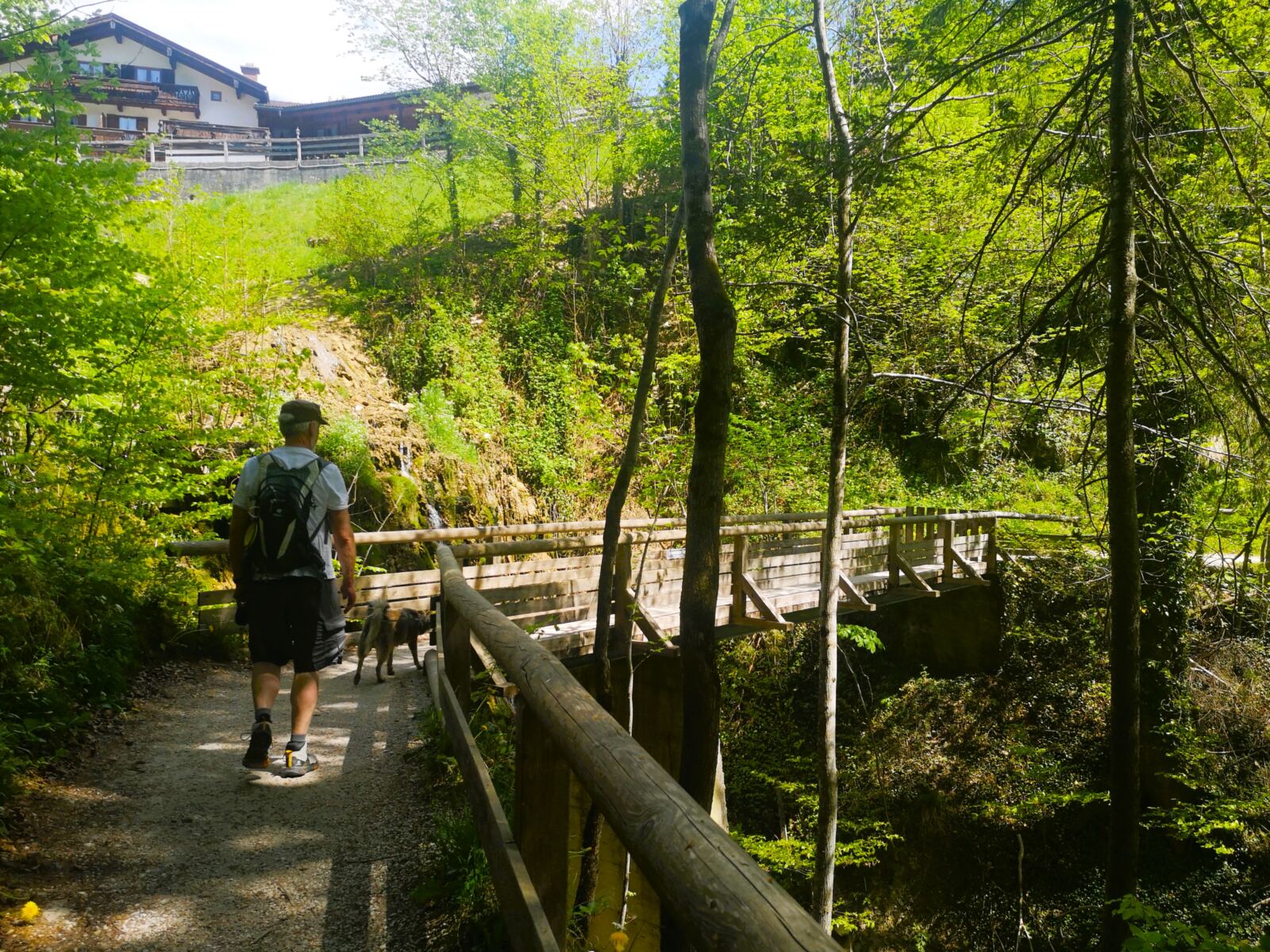 Wir tauchen wieder ein in den Wald, folgen weiter den Wegweisern Richtung Wimbachbrücke. Unser Weg stößt auf eine breite Sandstraße (Sonnleiten). Wir halten uns links und steil bergab. Unser Weg mündet auf das geteerte Anwohnersträßchen Kederbacherstraße. Wir halten uns recht, folgen der Straße bergab zur vielbefahrenen Berchtesgadener Straße, die wir überqueren. Wir laufen über die Brücke über die Ramsauer Ache und spazieren am Fluss entlang ortseinwärts. Wenig später gesellt sich auch der Mühlenbach hinzu.