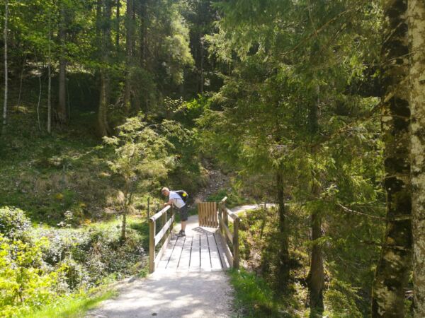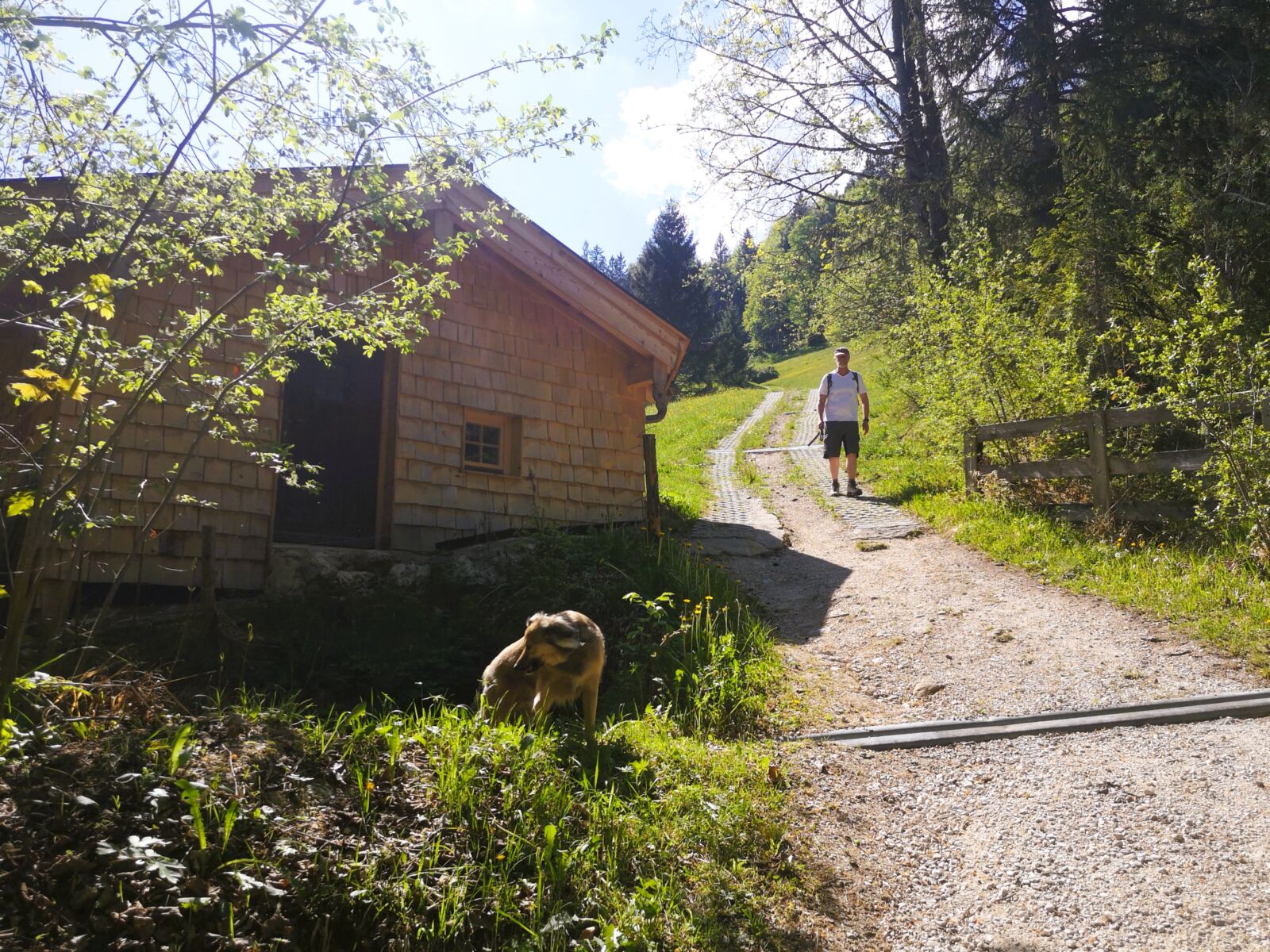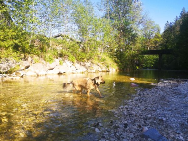 Wir tauchen wieder ein in den Wald, nun sanft steigend. Unser Weg stößt auf die geteerte Anliegerstraße Kunterweg. Wir laufen an Höfen vorbei bergauf in Richtung der befahrenen Alpenstraße. Kurz davor folgen wir einem Trampelpfad rechts ab. Er bringt uns über eine Brücke über den Pietzergraben. Unser Amos hüpft erst mal ins Wasser.