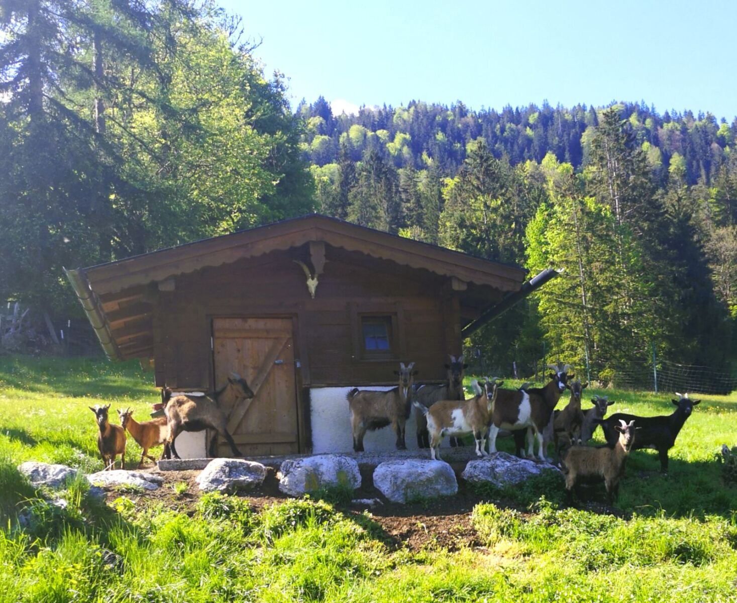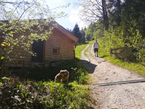 Wir verlassen den Soleleitungswegs. Vom Berggasthof Gerstreit aus beginnt der Abstieg. Wenige Meter unterhalb des Berggasthofs, leicht nach links versetzt liegt ein Bauernhof. Direkt dahinter stoßen wir auf einen steilen, beschilderten Wanderweg Richtung Ramsau, Wimbachbrücke. Ihm folgen wir bergab. Der Weg biegt schließlich scharf rechts ab, vorbei an einem Wasserlauf erreichen wir offenes Gelände. Die Weiden gehören zu einem Ziegenhof an der Kederbachstraße. Der Wanderweg führt mitten durch den Hof. Achtung: Hier wohnen auch sehr zutrauliche Katzen.