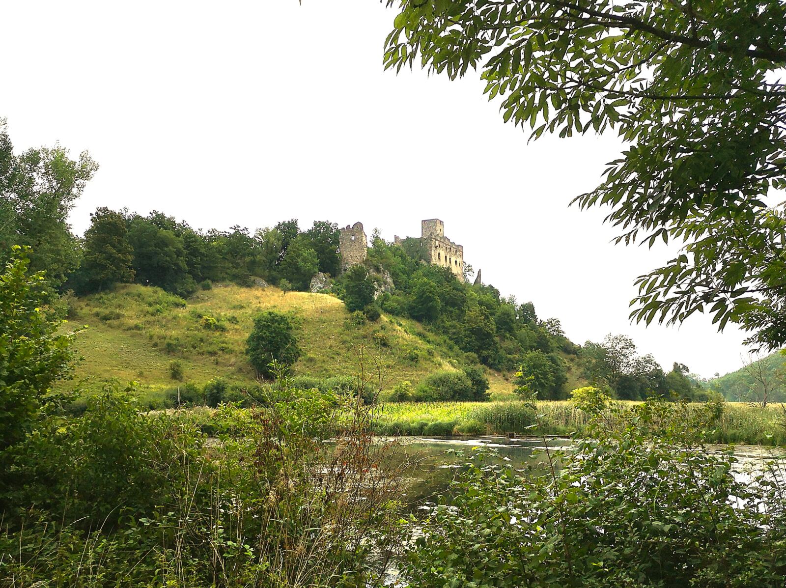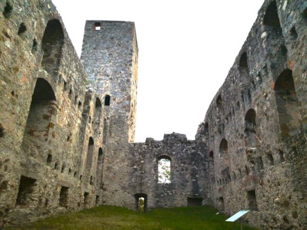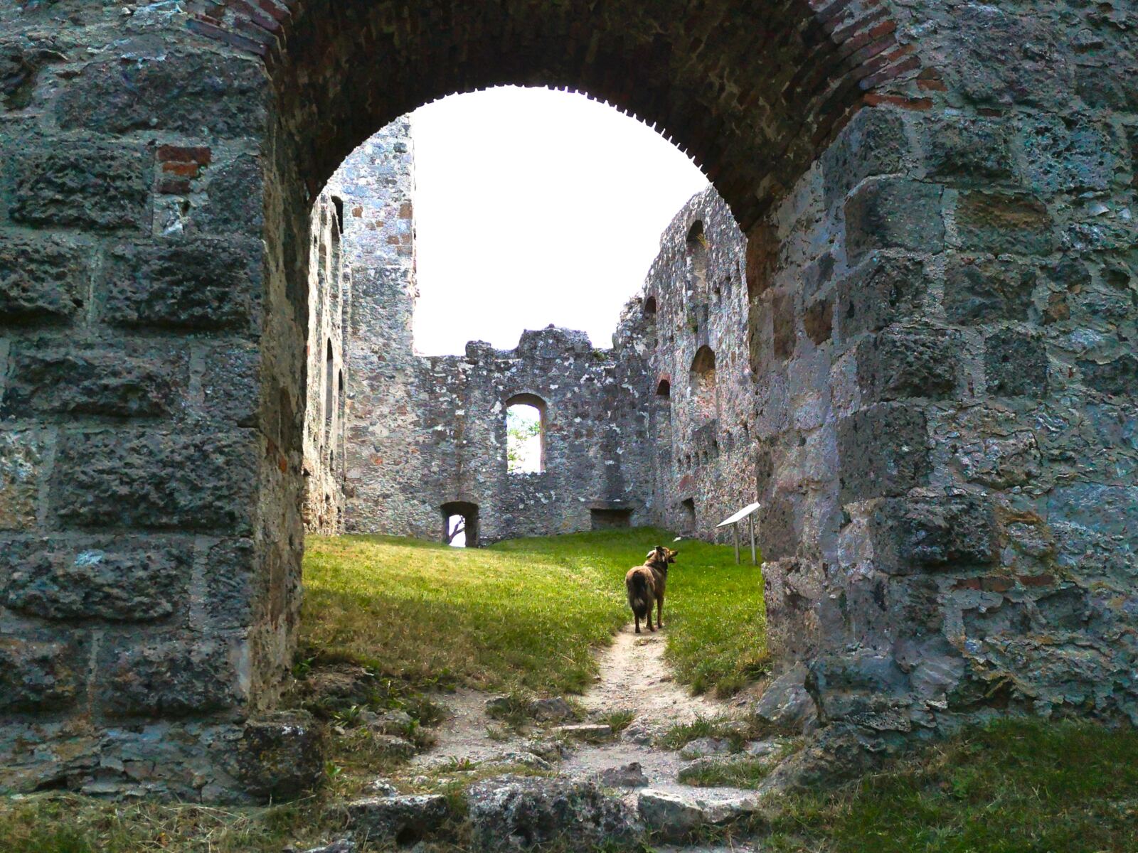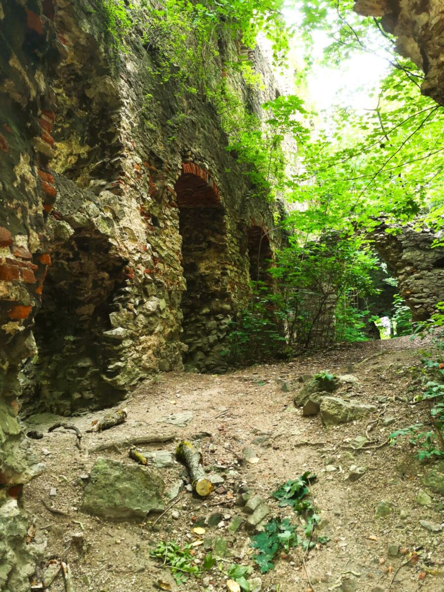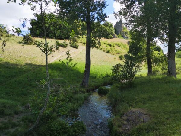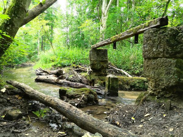 Achtung: Der Wegweiser zum nächsten Abschnitt ist leicht zu übersehen! Der Weg führt uns auf einem anfangs noch geteerten Sträßchen links am See vorbei Richtung Wald, dann rechts ab in den Wald hinein. Wir folgen dem nun wieder weichen Wanderweg parallel zum Forellenbach weitgehend eben durch den Wald. Unser Amos hüpft immer wieder in den hier wilden Bach. Kurz bevor der Pfad auf einen gekiesten Wirtschaftsweg trifft, biegen wir an der Kreuzung scharf links ab. Rechts steil steigen wir bergauf zur Ruine Hochhaus. Bäume und Büsche haben die Burg aus dem frühen 13. Jahrhundert längst erobert. Der Innenbereich hinter den bröckelnden Mauern bleibt uns verwehrt – Einsturzgefahr. Nach einer Runde um die Außenmauern kehren wir zur Kreuzung zurück.