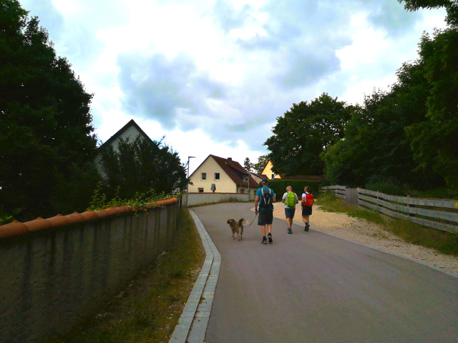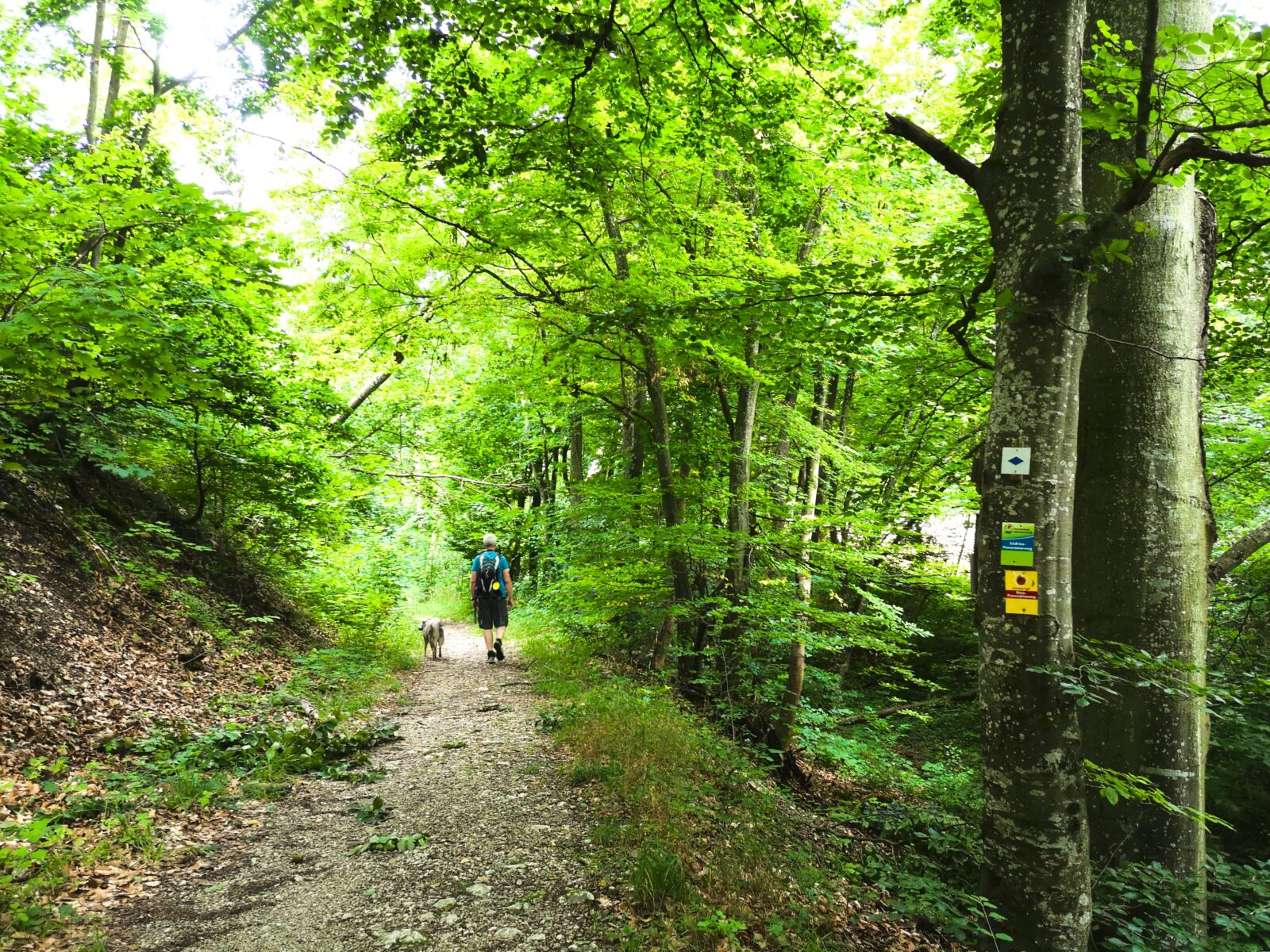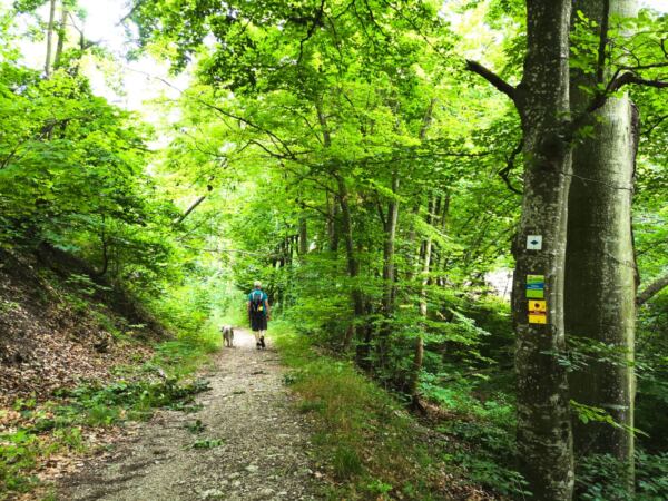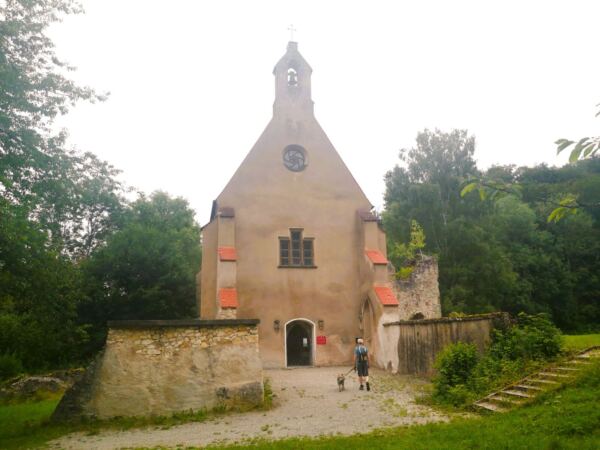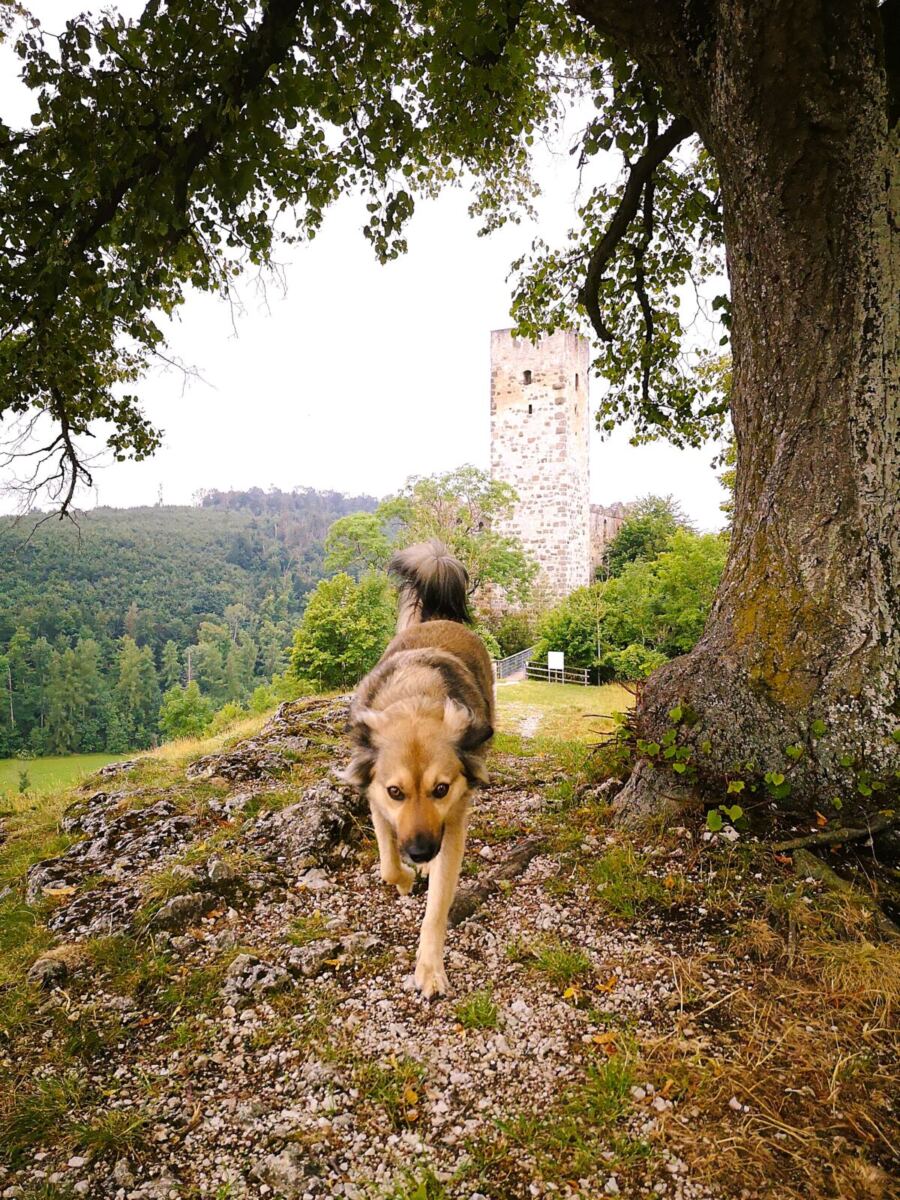 Unter einem ausladenden Ahorn legen wir eine kleine Rast ein, bevor es bergab weitergeht. Wir stoßen auf die Bundesstraße DON 9. Parallel dazu plätschert der Retzenbach. Unser Amos nutzt die Chance und taucht ab. Wir überqueren die Bundesstraße. Dann folgen wir der ruhigem Anwohnerstraße bergauf, halten auf eine stattliche Kastanie mit Bank zu, die an einer Kreuzung steht. Hier biegen links ab. Nach wenigen Schritten zweigt ein Wanderweg rechts ab – wir folgen ihm bis zur Ruine Niederhaus.