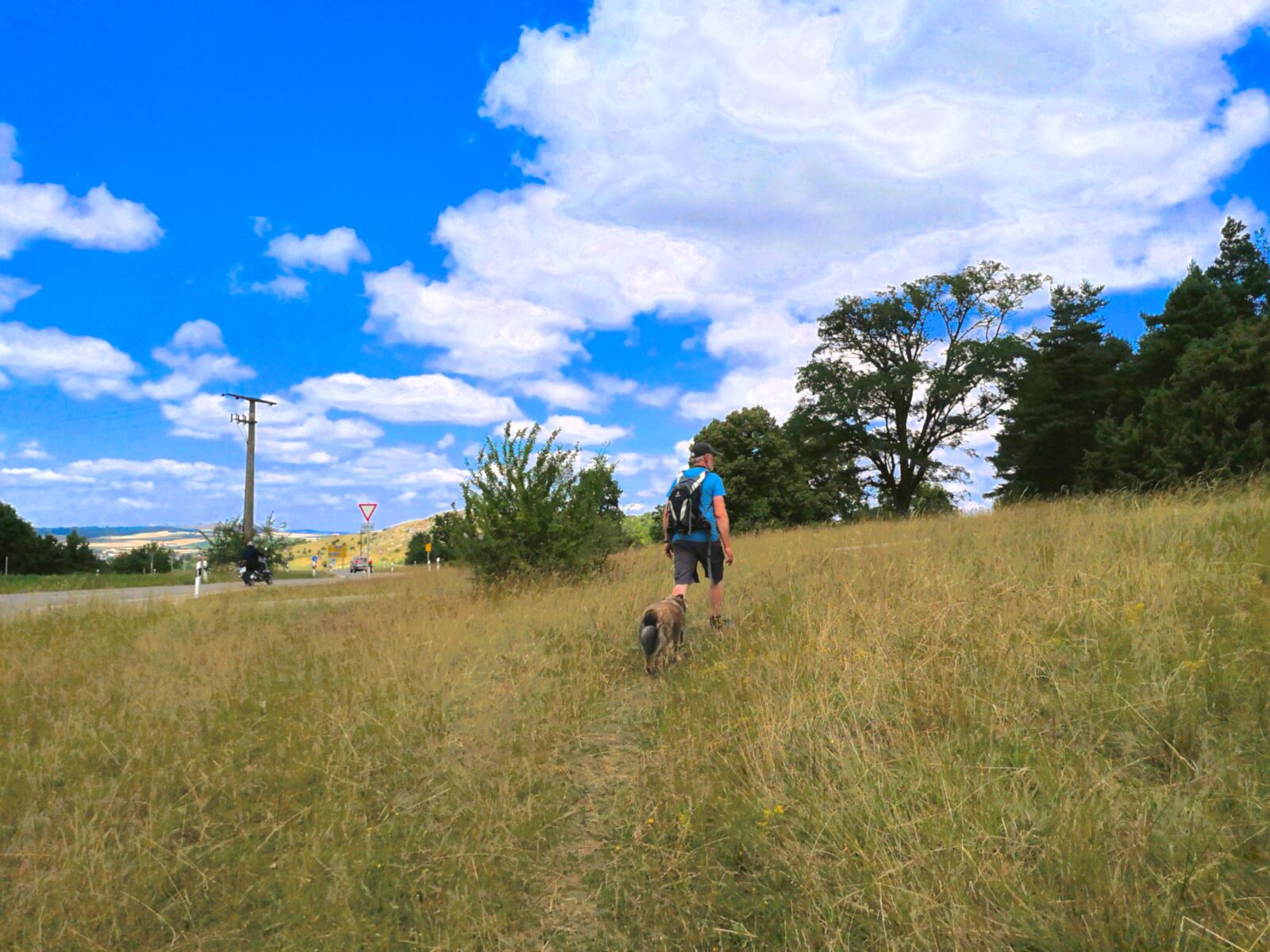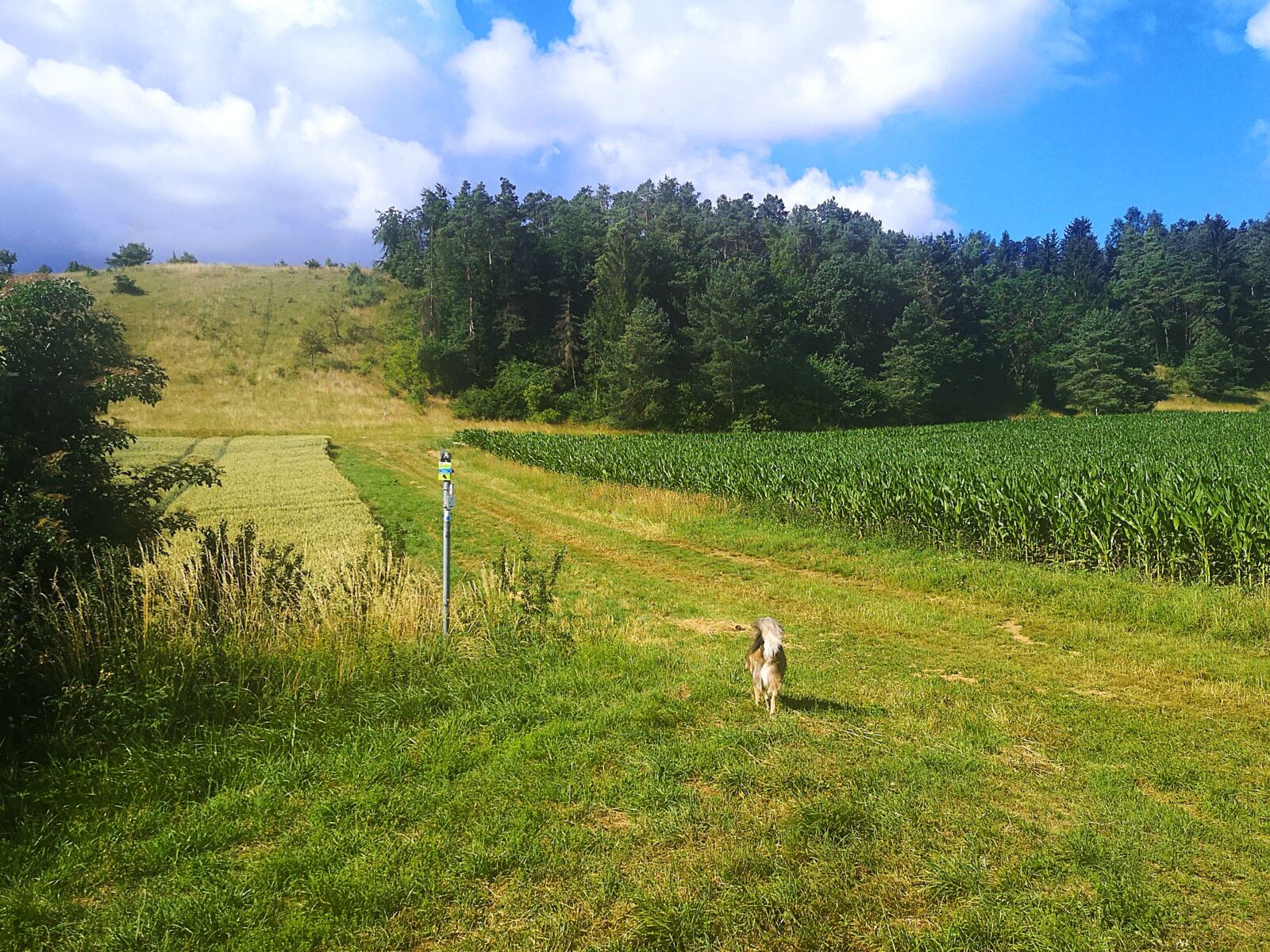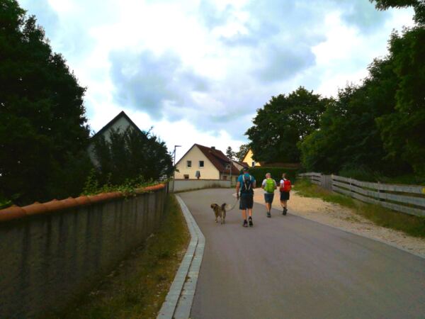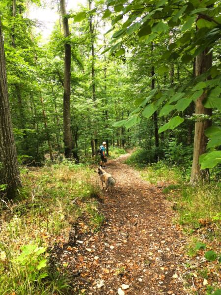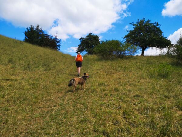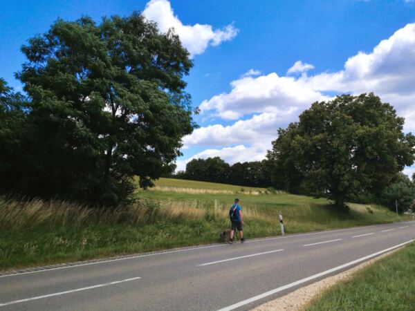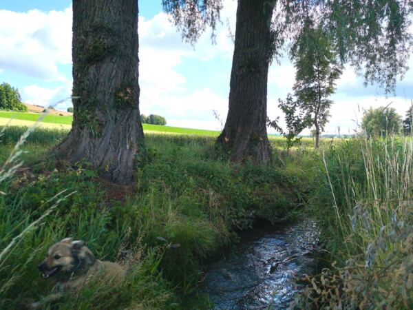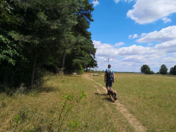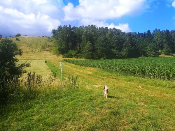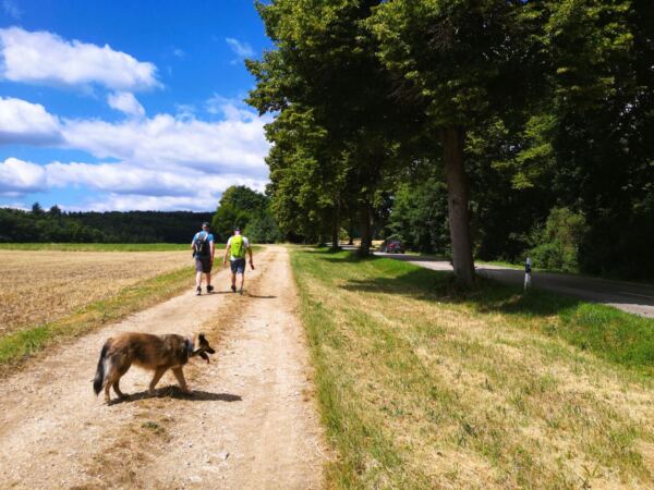 Schatten ist eher rar – gerade im Hochsommer kann die Sonne erbarmungslos brennen. Daher: lieber früh aufbrechen und reichlich Wasser für Mensch und Hund mitnehmen. Immer wieder gibt es aber auch Möglichkeiten zur Erfrischung an Bächen oder Weihern – zur Freude unserer vierbeinigen Begleitung 🌿💧. Die Strecke ist insgesamt sehr hundefreundlich, mit wenigen Straßenquerungen und viel Platz zum Laufen.