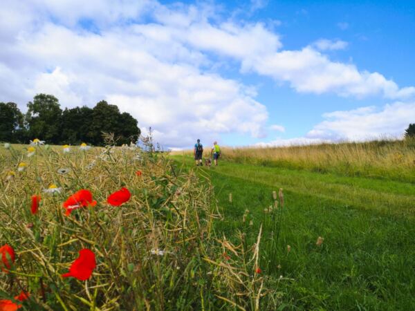 Wir folgen dem Wanderweg zwischen Waldrand und Feldern bergauf. Er mündet in einen Wirtschaftsweg, der uns ein gutes Stück geradeaus zwischen Feldern entlangführt. Schließlich biegt unser Weg links ab, führt durch eine weitere Heidefläche sanft bergauf. Es geht weiter geradeaus auf einem Wiesenweg zwischen Feldern bis zum Reimlinger Wäldchen. Wir halten uns rechts, tauchen in den Wald ein und erreichen kurz darauf wieder unseren Ausgangspunkt.