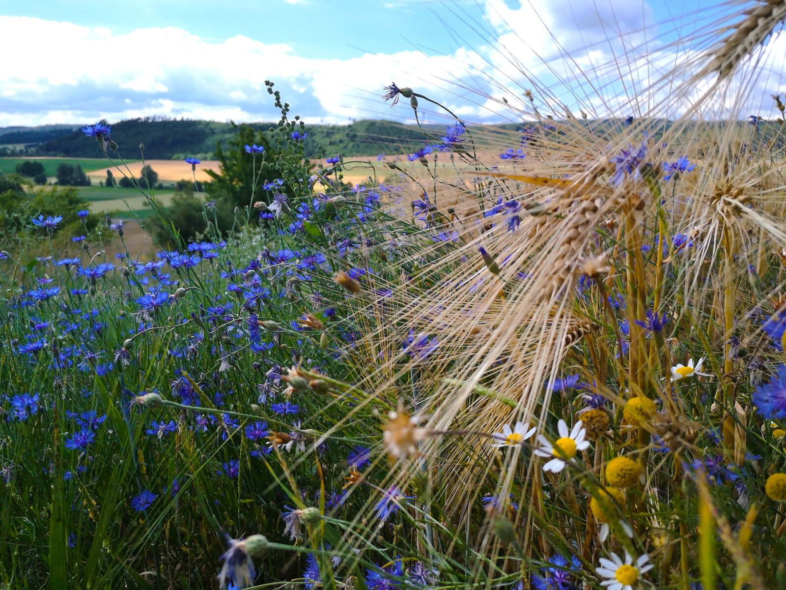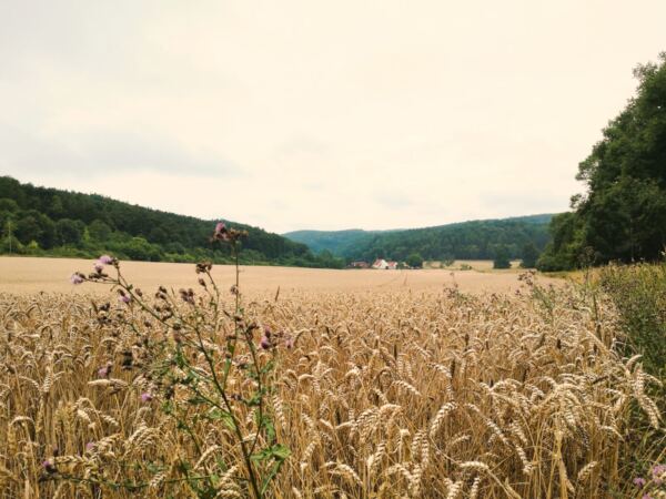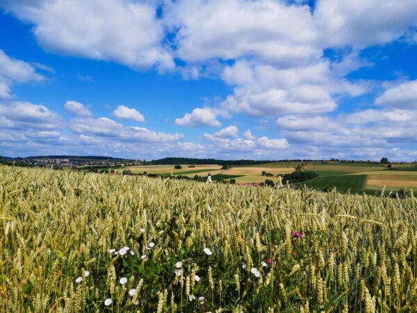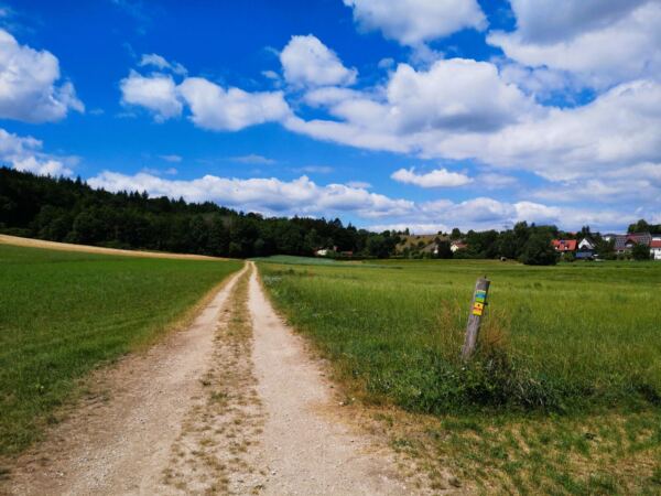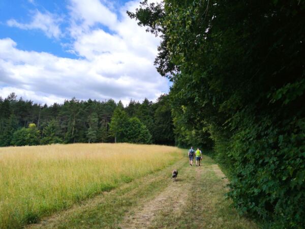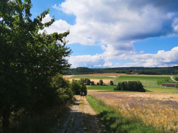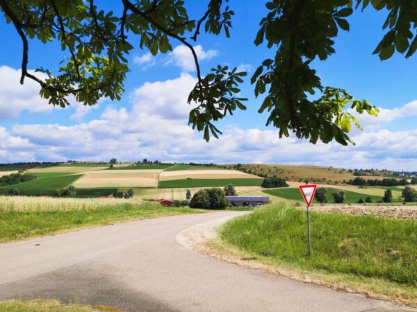 An der Kreuzung folgen wir dem Wirtschaftsweg nun geradeaus zur wenig befahrenen Autostraße. Wir überqueren die Straße und halten uns rechts. Nach wenigen Metern zweigt links ein Wanderweg ab, der uns bergauf durch Wald und freies Gelände auf einen Höhenrücken führt. Hier halten wir uns links und laufen mit weitem Blick auf Ederheim und die Albuch-Höhe am Waldrand entlang. Kurz geht es durch den Wald, dann entlang von Feldern hinunter nach Ederbach.