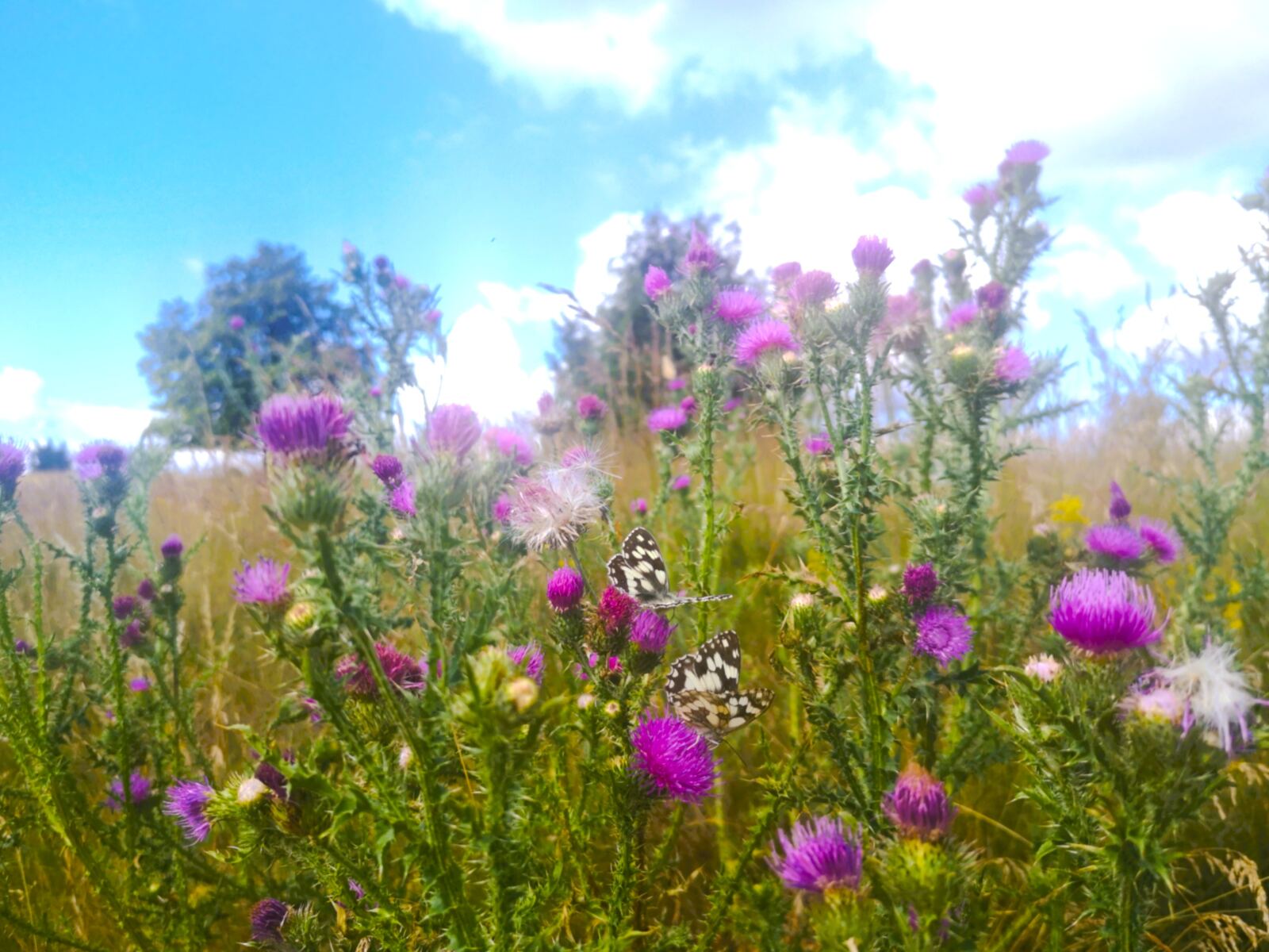 Der Wanderweg umrundet den kleinen Ort, führt vorbei an einem Pferdehof und dann rechts bergauf durch eine Heidefläche. Im Bogen geht es um ein Neubaugebiet. Wir erreichen schließlich die B 25 (DON 1) – Vorsicht, der Wegweiser auf der gegenüberliegenden Seite ist kaum zu sehen! Wir überqueren die Bundesstraße, halten uns direkt links und steigen wieder ein in den Wanderweg, der uns zunächst parallel zur Straße bergauf führt, dann nach rechts dreht. Nun stehen wir auf dem Schäferweg, dem der Südries-Panoramaweg von jetzt ab folgt.