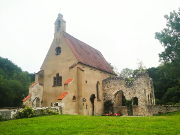 👉👉 Abstecher: Wer mag, wandert von hier aus zur gut 2 Kilometer entfernten Ruine eines Kartäuserklosters Christgarten mit seiner liebevoll renovierten Kirche. Dazu biegen wir links auf den mit hellem Kies befestigten Wirtschaftsweg ein und folgen dem Wegweiser Richtung Christgarten. Zwischen Wald und Feld laufen wir leicht bergauf. Nach wenigen Metern biegen wir rechts ab Richtung Wald, am Waldrand wieder rechts, immer der Beschilderung Richtung Christgarten folgend. Wir passieren eine Handvoll Häuser, halten uns links und erreichen bald einen schmalen Waldweg. Der Wanderweg führt uns eben durch den Wald, begleitet vom Forellenbach, und schließlich über offenes Gelände. Ein Holzsteg bringt uns über den Forellenbach. Dahinter biegen wir links ab und erreichen bald die Klosterruine, die auf einer weiten Wiese im Tal des Forellenbachs liegt. Um 1390 errichteten Mönche des Kartäuserordens das Kloster. Schweigen, Fasten, Beten – das Leben im Kloster war hart. Die Reformation, ein Brand und der 30-jährige Krieg erschütterten das Kloster.  1648 war sein Ende besiegelt. Das Kloster verfiel. Nur die „Laienkirche“ blieb erhalten. Noch heute lassen sich hier Paare trauen, und Mitglieder der umgebenden Gemeinden treffen sich  in den Sommermonaten  zum Gottesdienst. Ein schöner Ort für eine ausgiebige Rast. Danach laufen wir auf demselben Weg zurück zur Kreuzung, an der der Weg zur Ruine Hochhaus.  👈👈