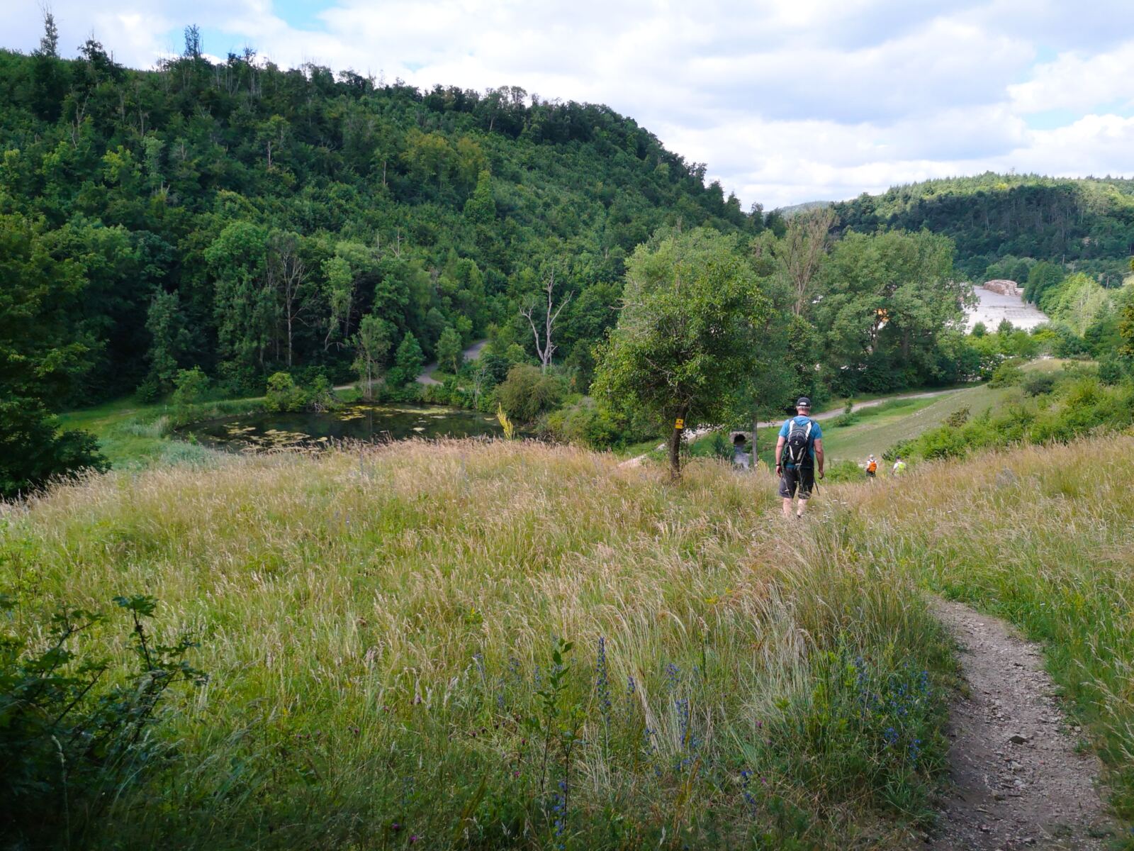 Wir durchqueren die Ruine und folgen einem schmalen Pfad bergab mit Blick auf den idyllischen Katzenweiher und den Forellenbach. Amos hüpft wieder in den Bach hinein. Herrlich! 😊.