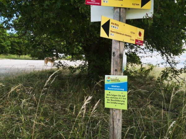 🥾 🐾 Die Rundwanderung ist insgesamt gut ausgeschildert, jedoch sollte man unterwegs aufmerksam bleiben, da manche Wegweiser zugewachsen sind. Zu Beginn wandern wir überwiegend auf weichen Wiesen- und Waldpfaden mit herrlichen Ausblicken über das Donau-Ries. In der zweiten Hälfte dominieren befestigte Wirtschaftswege durch die offene Feldflur.