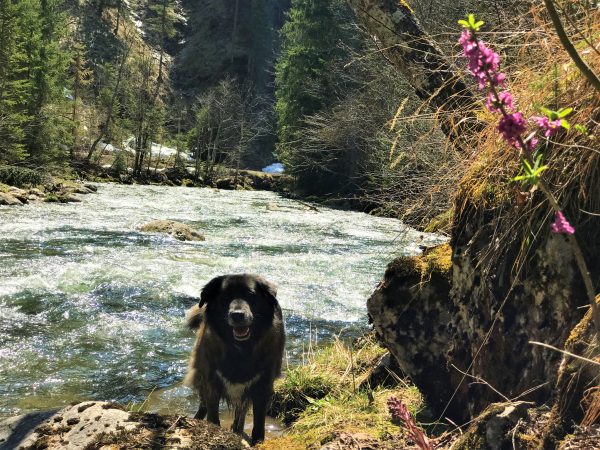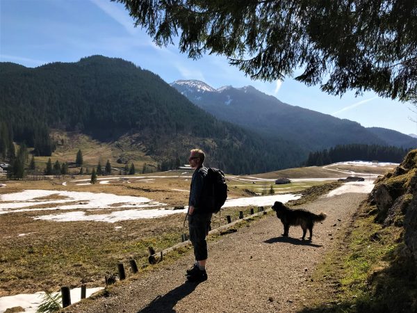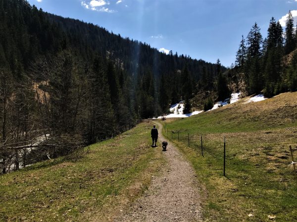 Diese Streckenwanderung bietet sehr viel Abwechslung für wenig Anstrengung. Den größten Teil der Strecke laufen wir entlang der Roten Valepp. Unser Hund hat also immer wieder die Möglichkeit, zu planschen und aufzutanken. Der Weg führt fast durchgehend über Waldwege, zwischendurch etwas Geröll und nur zum Schluss gibt es etwas Asphalt. Sonne und Schatten wechseln sich ab. Die Anstiege unterwegs sind kurz und sanft.