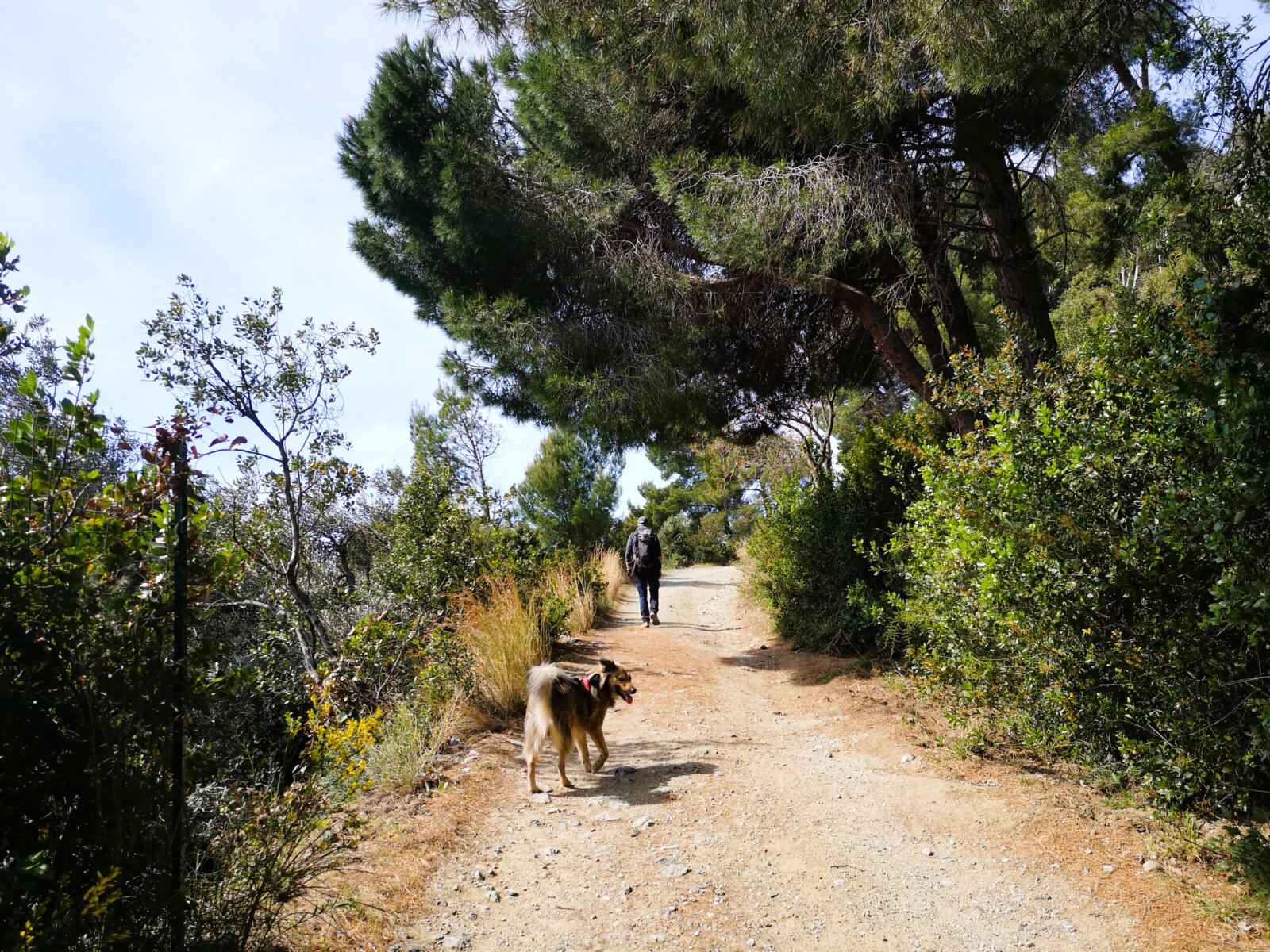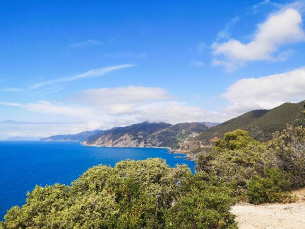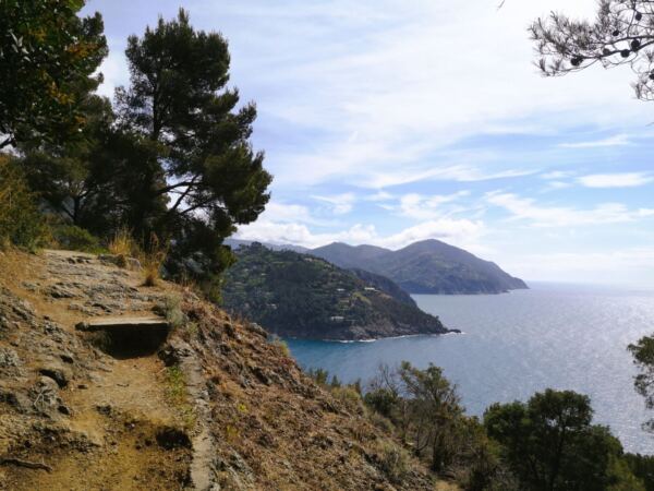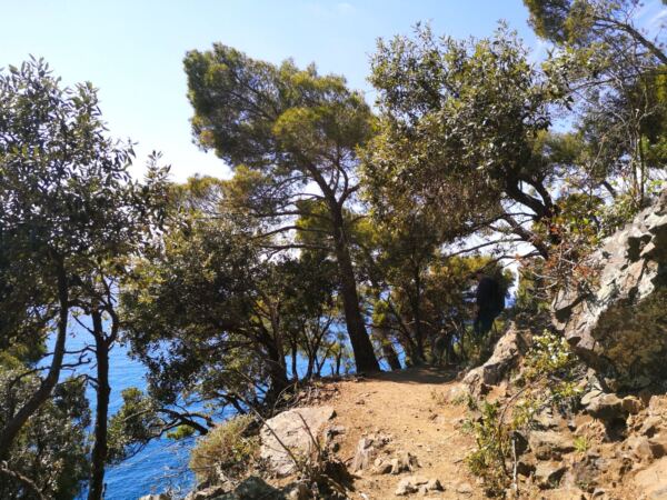Die Wege über dem Meer führen uns durch eine typische ligurische Küstenlandschaft: immergrüne Macchia, Pinien und Steineichen, dazwischen immer wieder offene Abschnitte mit weitem Blick auf das Meer und die zerklüftete Küstenlinie.