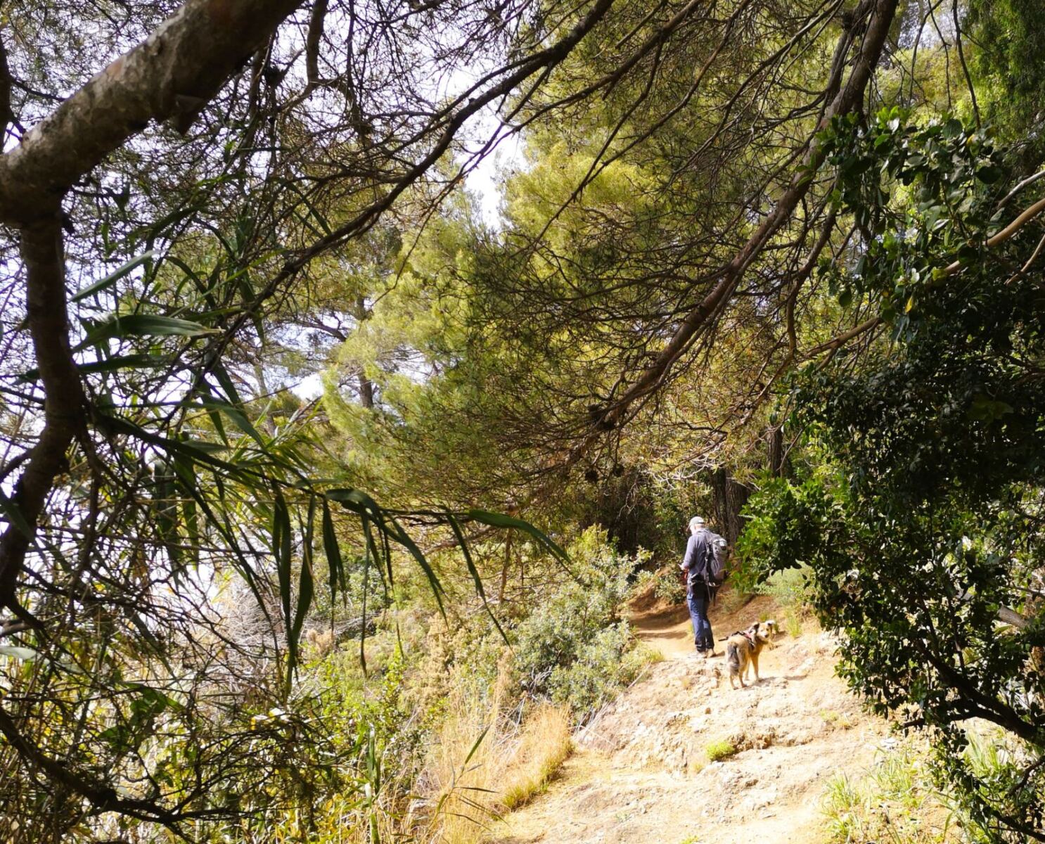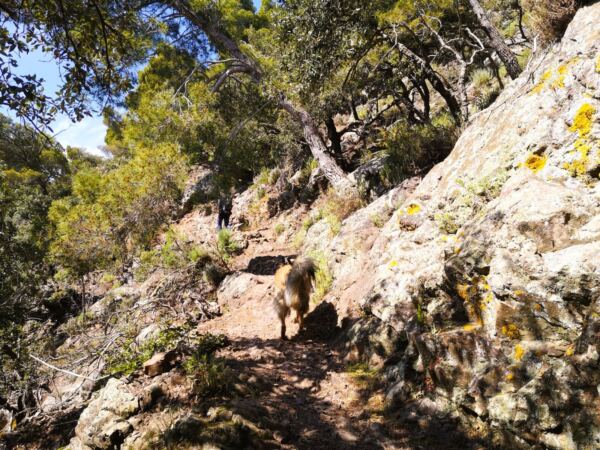 Wir erreichen eine Picknickbank unter ausladenden Schirmpinien. Links von uns biegt ein beschilderter schmaler und steiniger Pfad ab. Wir folgen ihm zunächst recht steil durch die Olivenhaine bergauf in den Wald. Bald wird der Weg flacher. Wir bleiben auf dem Pfad, der uns durch einen lichten mediterranen Wald bringt.