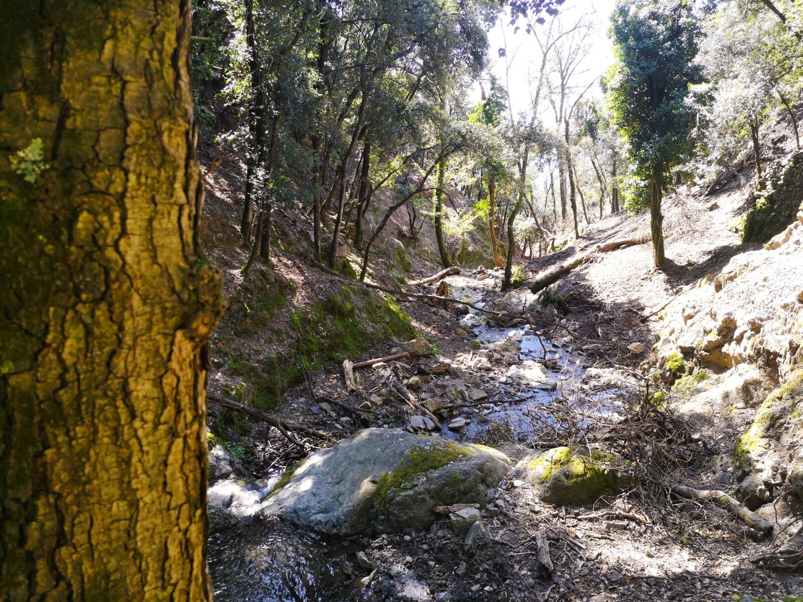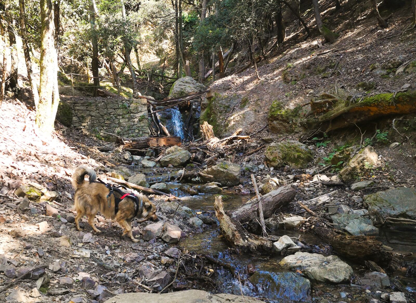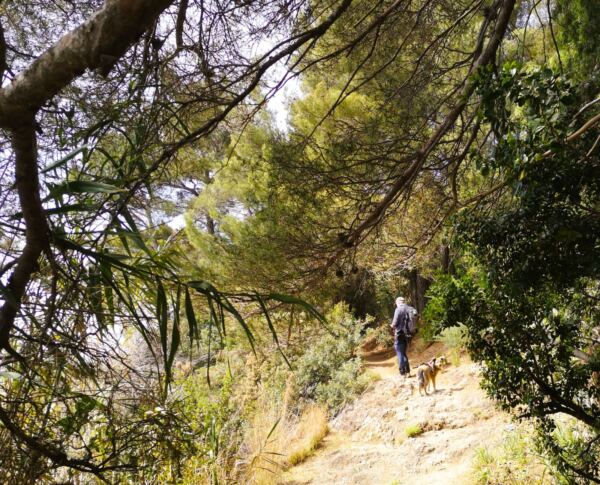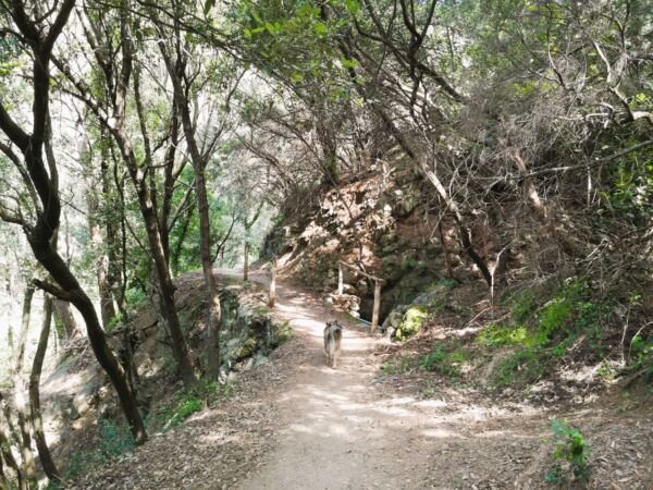Der nun breite und befestigte Wirtschaftsweg führt uns im Bogen um den Hang und dann nach einigen Windungen schließlich bergab Richtung Meer. Wenig später verlassen wir den Wirtschaftsweg und biegen scharf nach rechts ab Richtung Framura. Der nun wieder sehr schöne wilde Pfad führt uns durch den Wald, teils steinig-felsig, teils herrlich sandig. Eine kurze Passage bringt uns nochmal durch bewirtschaftetes Gelände mit Oliven und Wein, bevor der Pfad wieder in den Wald abtaucht. Es geht bergab, wieder bergauf, dann bergab zu einem Bach, den wir über eine Brücke queren. Hier legen wir eine Rast ein, damit Amos ausgiebig baden kann.