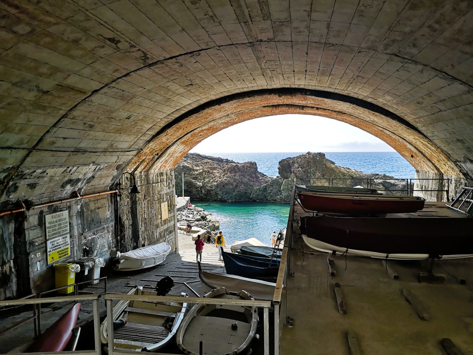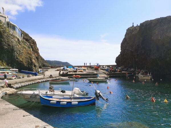 Danach geht es weiter steil bergan. Der Pfad führt uns aus dem Wald heraus und auf steinigem Untergrund um den Berg herum – wie eine Balustrade mit großartigem Blick übers Meer. Schließlich erreichen wir die ersten Häuser von Framura. Mit schönem Blick auf den kleinen Hafen von Framura laufen wir die Anwohnerstraße hinab. Wir gelangen an eine Kreuzung. Rechts und weiter bergauf erreicht man das Zentrum von Framura. Wir halten uns links und steigen über eine Treppe hinab zum Hafen.