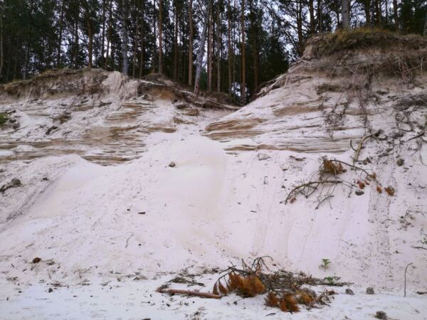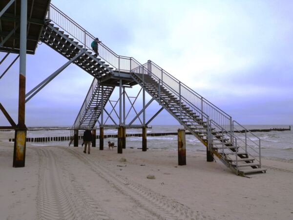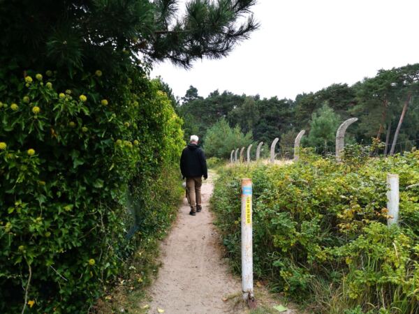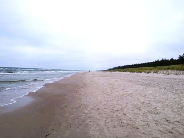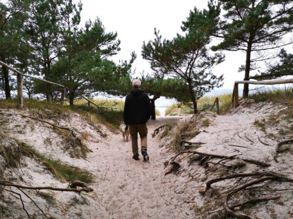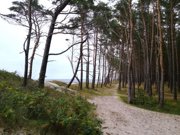 Diese kleine Runde kombiniert einen Strandlauf mit einem Waldspaziergang. Dazwischen kehren wir ein auf einen Kaffee an der Hauptstraße in der Bäckerei und Eisdiele „Sklep firmowy krerowicz“. Ausgangspunkt ist der Campingplatz. Wir laufen die wenigen Meter vor bis zur Hauptstraße und überqueren sie über den Zebrastreifen. Wir halten uns rechts, biegen gleich neben dem Gelände der Ferienanlage Rezydencja Nadmorska links ab auf den Wanderpfad Richtung Wald und Strand. Wir folgen diesem Weg immer geradeaus und erreichen den Strand über einen offiziellen und besonders schönen Abgang. Die kleine Krüppelkiefer mit dem breiten Schirm fiel keiner Axt zum Opfer, sondern durfte mitten auf dem Weg stehenbleiben.