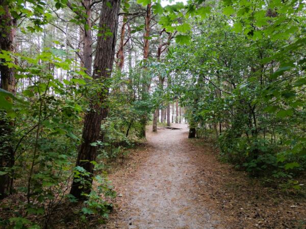 Nun an der Hauptstraße entlang laufen wir vor zur Bäckerei, die neben einem kleinen Supermarkt und einer Apotheke liegt. Nach einem Kaffee und Waffeln geht’s weiter. Bei nächster Gelegenheit biegen wir links ab von der Hauptstraße und spazieren in den Wald. Hier biegen wir rechts ab. Durch den Wald wandern wir zurück bis zur Rezydencja Nadmorska.