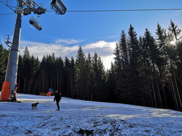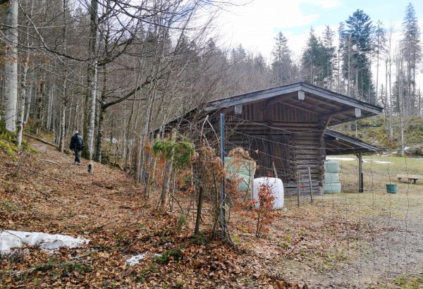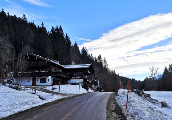 Wir machen immer gerne noch einen Abstecher bei der Lukas-Alm, weil die höher und damit länger in der Sonne liegt. Die hat nicht so verlässlich offen wie die Moni-Alm, aber eine kleine Rast auf der Bank vor der Hütte mit winterlichem Sonnenbad lohnt unseres Erachtens trotzdem – auch wenn wir einmal die Skipiste kreuzen müssen. Die Zufahrt zur Lukas-Alm führt bergab zur Moni-Alm.