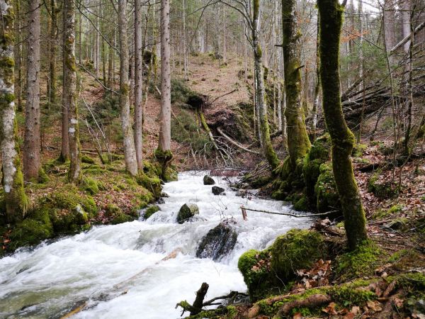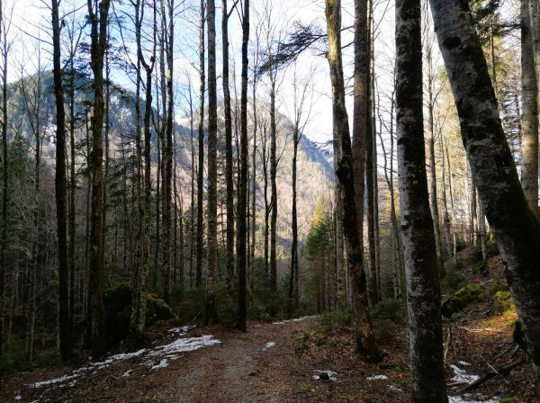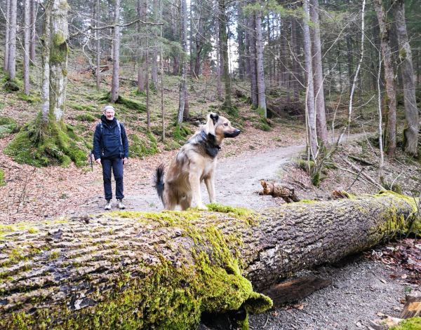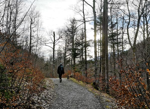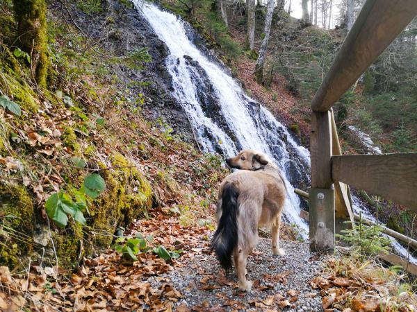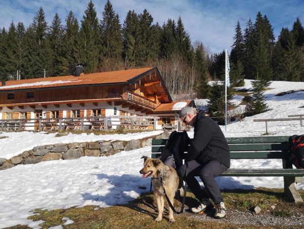 Rund ums Jahr hat die Moni Alm, rund 10 km südöstlich vom Tegernsee, geöffnet. Für uns ein gutes Zwischenziel für eine kleine Winterwanderung mit Hund, die uns nach viel Stubenhockerei ein wenig durchpustet. Unser Weg führt sanft steigend parallel zur Mautstraße Enterrottach Richtung Forsthaus Valepp durch den Wald. Er ist auch bei Schmuddelwetter und Restschnee gut zu gehen und wartet sogar mit einem kleinen Höhepunkt auf: der Abstecher bei den Rottach-Wasserfällen. Bei Schneeschmelze tosen die besonders beeindruckend. Auf der Strecke gilt Leinenpflicht. Wenn wenig los ist, tut`s eine Schleppleine allemal. Und wenn man ganz allein ist und sich der (nichtjagende!) Hund ohnehin an den Beinen seiner Leute hält, geht`s auch mal ganz ohne.