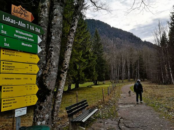 Unsere Tour startet am großen Wanderparkplatz „Mautstation“ an der Valepper Straße in Enterrottach. An der Bushaltestelle „Enterrottach Almhof“ zweigt links, parallel zur Mautstraße, unser Wanderweg ab. Es geht bergauf durch lichten Wald, ein kurzes Stück am Bodenalmgraben vorbei, in dem es auch mächtig rauscht. Etwa auf halber Strecke kreuzt unser Weg die Valepper Straße. Bald schon kommt das Hinweisschild zu den Wasserfällen. Wir laufen die Treppen auf dem schmalen Pfad bergab zu den Wasserfällen. Danach geht es wieder zurück und wenige Schritte auf der Straße entlang. Nun rechts von der Mautstraße folgen wir unserem Wanderweg weiter bergauf, kreuzen schließlich wieder die Mautstraße. Es geht hinauf in den Wald, wir folgen den Hinweisschildern Richtung Moni-Alm, Sutten und Lukas-Alm. Schließlich erreichen wir die Talstation der Suttenbahn an der Skipiste (Sessellift, nix für Hunde). Auf direktem Weg geht es von hier aus über den Parkplatz des Skilifts und weiter über die Mautstraße zur Moni-Alm. Kaffee, Kuchen, Sonne (wenn man im Winter früh genug kommt).
