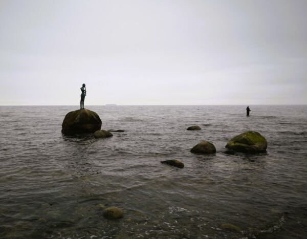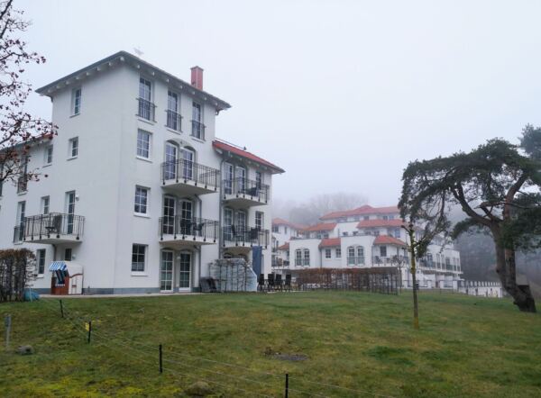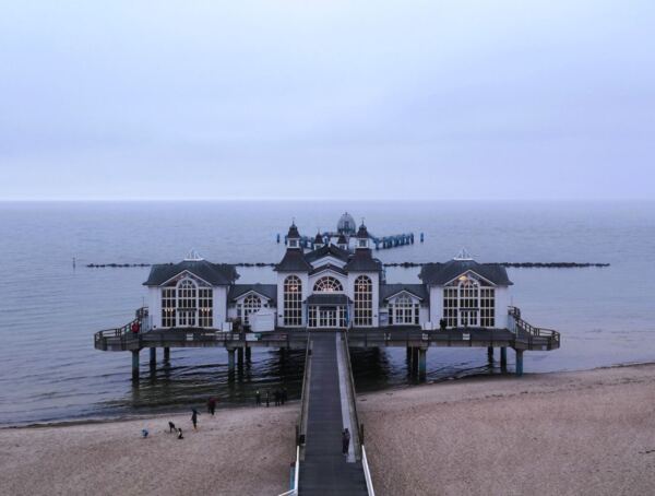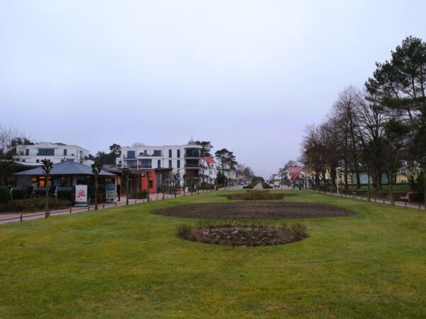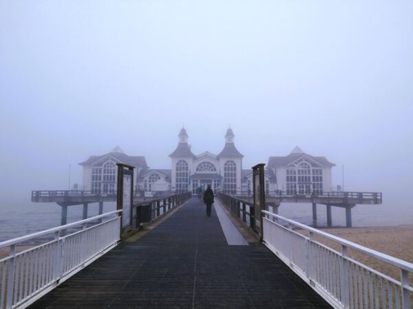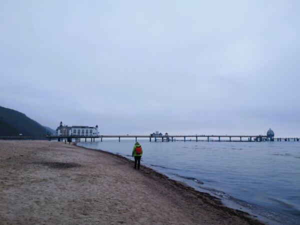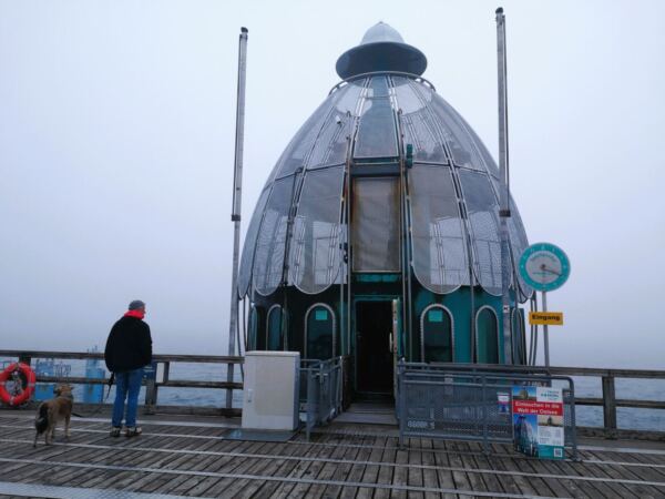 Ausgangspunkt unserer Runde ist der große Parkplatz an der Bade- und Erlebniswelt Ahoi Rügen an der Bundesstraße 196. Hier findet sich auch mit Wohnmobil ein Plätzchen. Wir folgen der Ostbahnstraße bis zu deren Ende. Hier biegen wir links ab auf die Luftbadstraße. An der nächsten großen Kreuzung biegen wir rechts ab auf die Wilhelmstraße – und sind begeistert. Die Bäderarchitektur zeigt sich hier in voller Pracht. Unter Linden (bei unserem Spaziergang noch unbelaubt) laufen wir geradeaus Richtung Meer, vorbei an Villen mit liebevoll sanierten Fassaden, hinter denen heute wie zu Kaiserzeiten Urlaubsgäste residieren. Die Wilhelmstraße endet am Treppenabgang (oder Lift) zur Seebrücke. Bevor unsere Wanderung so richtig beginnt, statten wir ihr einen ersten Besuch ab, wandern hinaus zur Tauchglocke am Ende der Brücke.