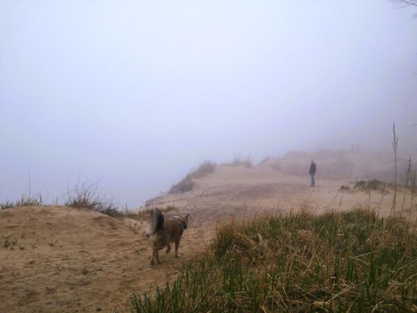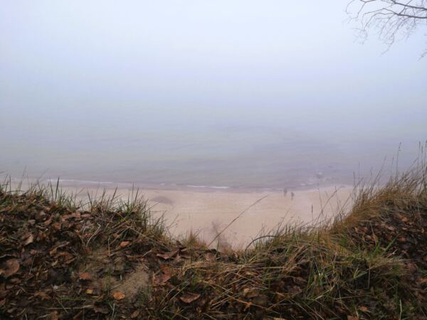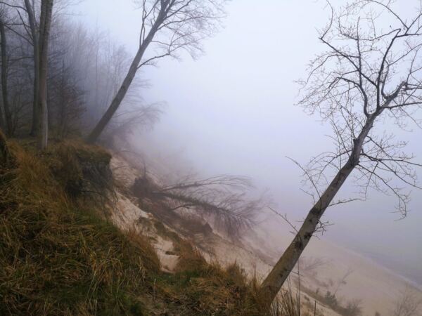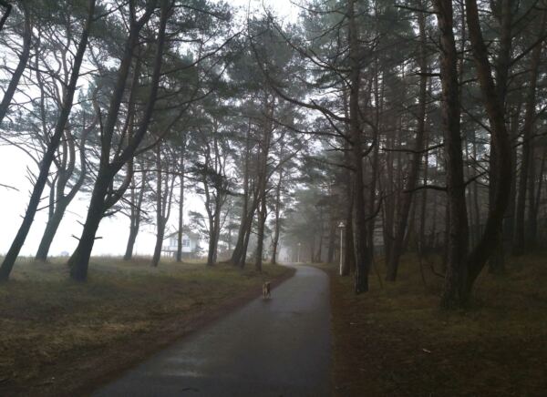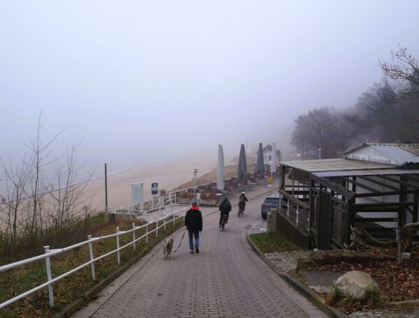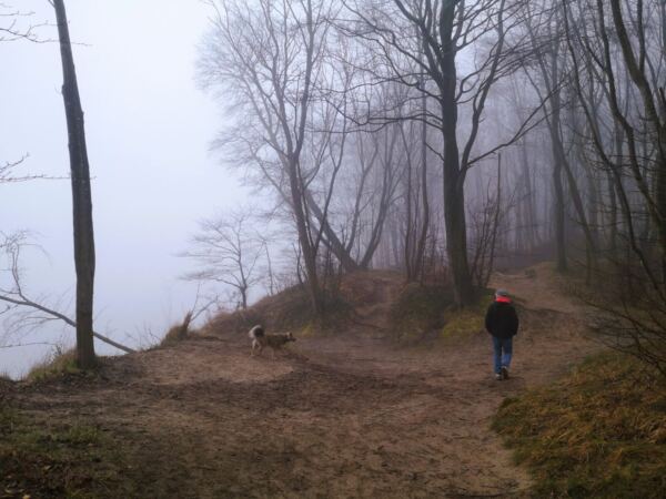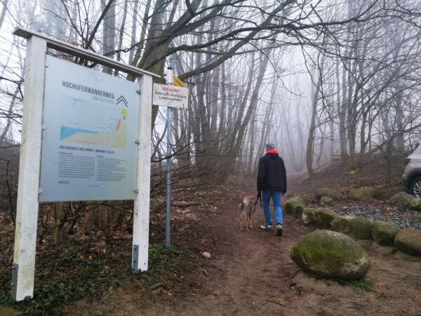Wir laufen zurück und wieder die Treppe hinauf. Die Seebrücke im Rücken biegen wir gegenüber vom Kurhaus links ab und steigen eine Treppe hinauf. Hier beginnt der Hochuferweg, zunächst noch gepflastert. Hinter dem Parkplatz des Hotels Bernstein biegen wir links ab auf den sandigen Waldweg, ausgeschildert als „Hochuferweg Südstrand Sellin“. Ab hier kann Amos freilaufen. Weil das Wetter nur lala ist, treffen wir nur auf wenige Menschen, und Amos kommt auf dem schmalen Pfad niemanden in Quere.