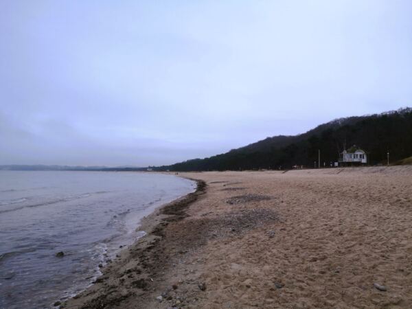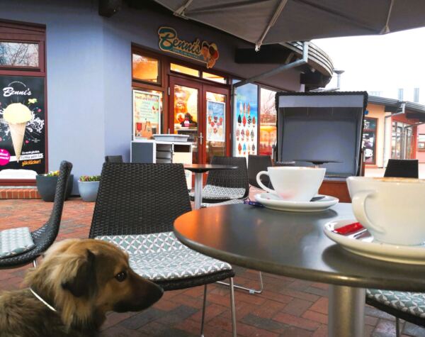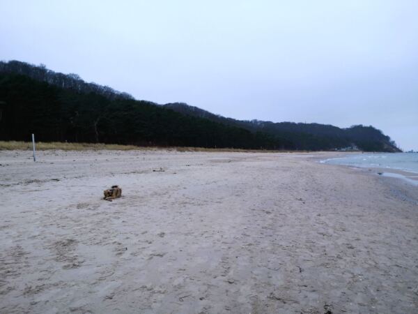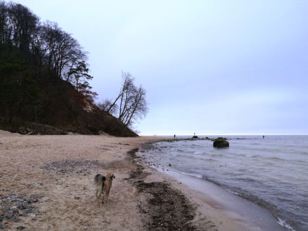Zunächst hügelaufwärts, dann in leichtem Auf und Ab geht es immer am Kliff entlang durch lichten Wald. Der gibt immer wieder Blicke über das Meer frei. Unser Weg mündet schließlich in ein gepflastertes Sträßchen. Mit Amos nun wieder an der Leine laufen wir bergab zum Südstrand von Sellin. Woir folgen dem Sträßchen unter Bäumen weiter geradeaus nach Baabe. Kurz hinter dem Cliff Hotel biegen wir ab auf den Fritz-Reuter-Weg. Kurz darauf biegen wir ab auf die Straße „Am Kurpark“ und laufen am Kurpark vorbei. Wo sich die Straßen „Am Kurpark“ und Strandstraße kreuzen, machen wir eine Pause in „Bennis Eiscafé“. Das bietet superleckeres Eis aus eigener Herstellung in Bio-Qualität. Wer kein Eis mag: Um die Ecke lockt das Café Klatsch mit selbstgebackenem Kuchen. Nach der Rast laufen wir über die Strandstraße vor zur Promenade und biegen links ab Richtung Sellin. Am Strand, zunächst offizieller Badestrand, dann Naturstrand, laufen wir zurück zur Seebrücke. Ab hier Rückweg wie Hinweg.