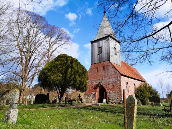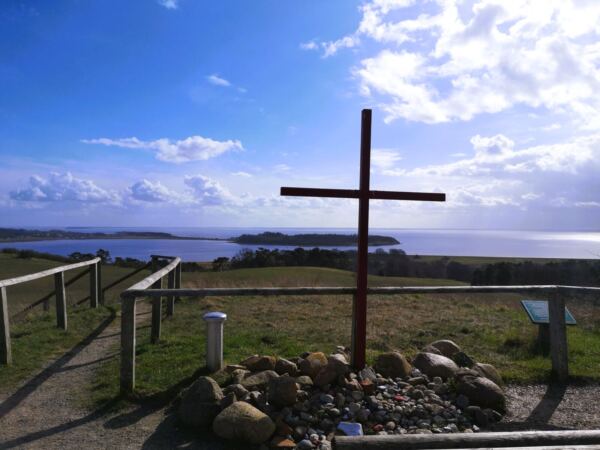 Ausgangspunkt unserer Tour ist der große Parkplatz an der Dorfkirche von Groß Zicker. Hier lässt sich auch ein Wohnmobil parken. Auf der gepflasterten Dorfstraße laufen wir in den Ort hinein. Bald erreichen wir rechts am Weg einen Spielplatz mit geschnitzten Figuren. Hier biegen wir rechts ab. Der Weg geht über in den Wanderweg, der uns über die Wiese Richtung Wäldchen hügelaufwärts bringt.  Auf dem Hügelrücken ist alles gut überschaubar. Wer mag, kann einfach der Nase nach da und dorthin dem Wanderpfad folgen. Wir halten uns zunächst rechts und statten dem Gipfelkreuz auf dem Bakenberg einen Besuch ab. Dann laufen wir zurück und folgen dem Wanderpfad immer geradeaus zum Aussichtspunkt am Zickerberg. Wir folgen dem Pfad, der uns mit Blick auf Klein Zicker hügelabwärts, dann inseleinwärts durch Groß Zicker bringt. Vorbei am Pfarrwitwenhaus geht es zurück zum Ausgangspunkt – und zu einem Kaffee im Gastgarten von „De Wienkist“.