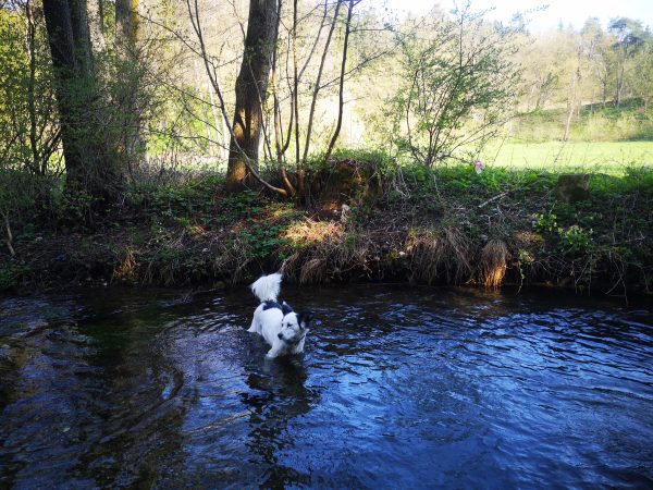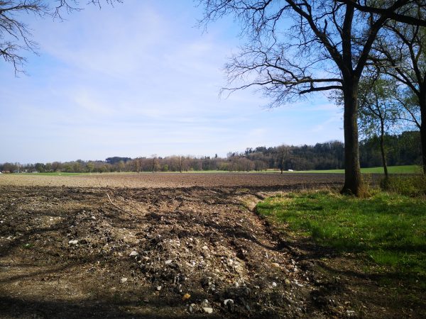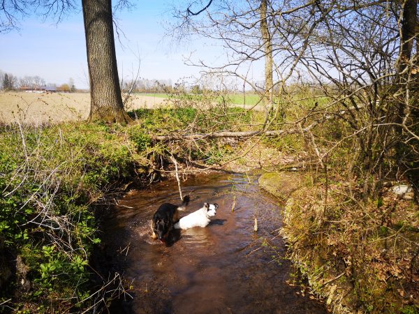 Unten angekommen biegen wir rechts ab, auf einen Feldweg zum Klughamer Moos. Hier verläuft ein Graben neben dem Weg, den die Hunde für die erste Badepause nutzen.