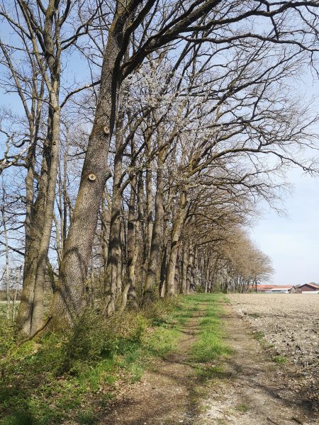 Dort verlassen wir den Schatten der Bäume und wandern jetzt zwischen Feldern nach Monham. Geradeaus geht’s durch den kleinen Ort hindurch und wieder auf einen Feldweg.