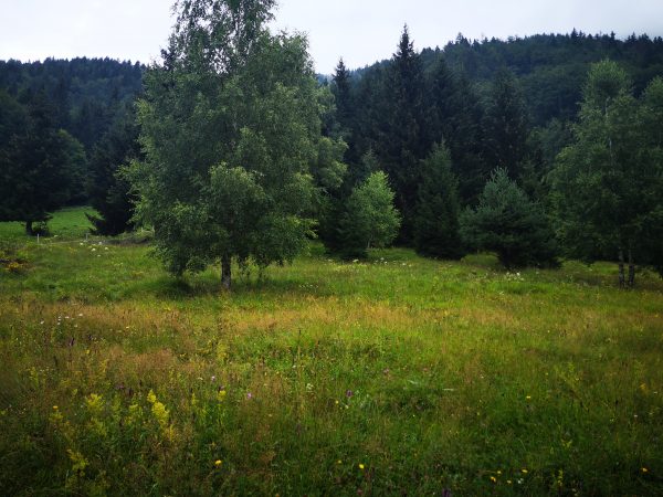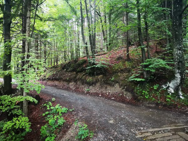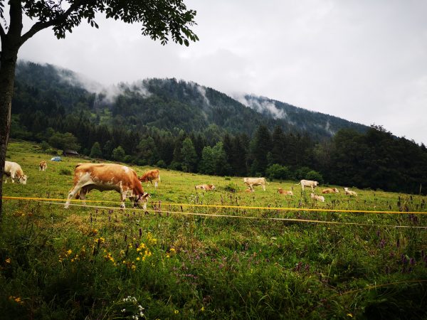 Kurz nach Start der Tour beginnt der Weg anzusteigen und führt dann in Serpentinen über einen breiten Forstweg bergauf. Nach einem kurzen Abschnitt über Asphalt erreichen wir das kleine, urige Restaurant Gostilna Srnjak. Wir gehen in einer Rechtskurve um das Gebäude herum und dann geradeaus. Entlang unserer Strecke treffen wir immer wieder auf idyllische Holzhäuschen, auf den zugehörigen Weiden grasen Kühe.