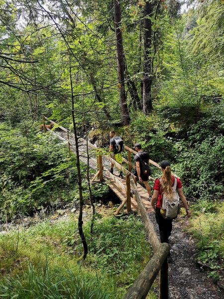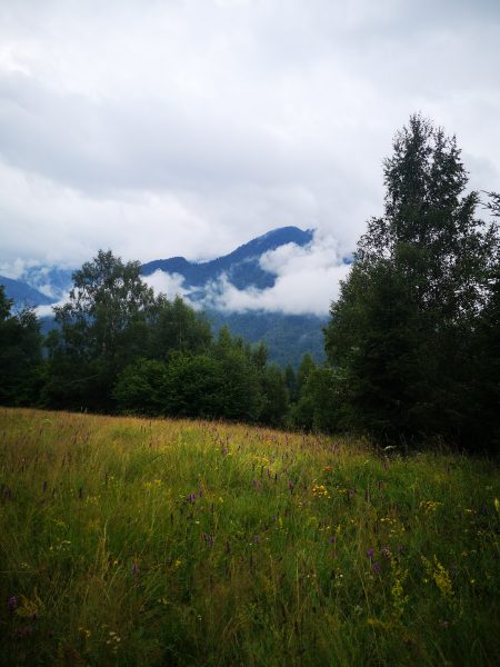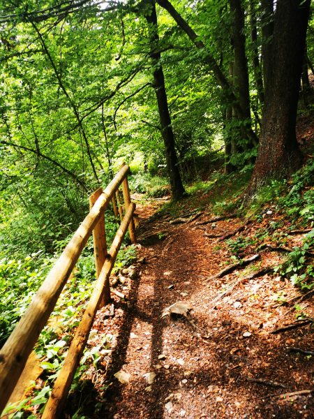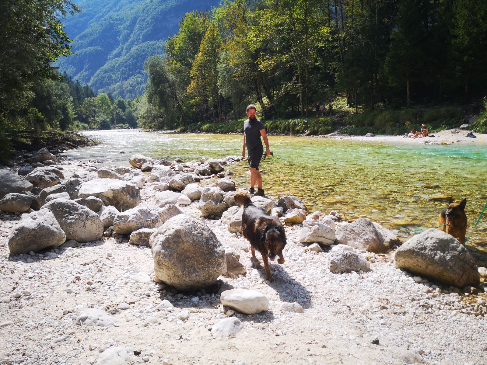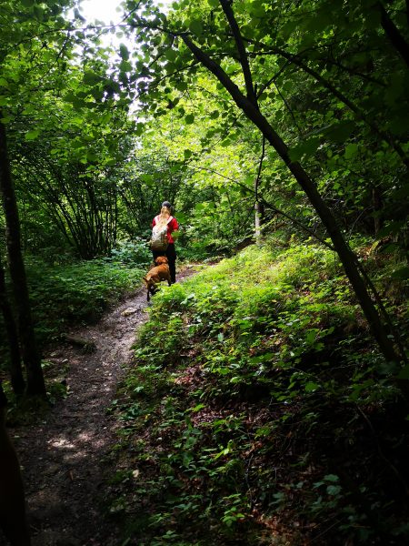 Dann wird der Weg zu einem schmalen Pfad, der zumindest aktuell noch nicht auf OpenStreetMap verzeichnet ist. Über Stock und Stein geht es durch den Wald nach unten. Zum Teil ist der Pfad recht steil und holprig. Dann mündet er in einen Forstweg der uns zur Sava führt. Entlang dieser geht es zurück zum Ausgangspunkt.