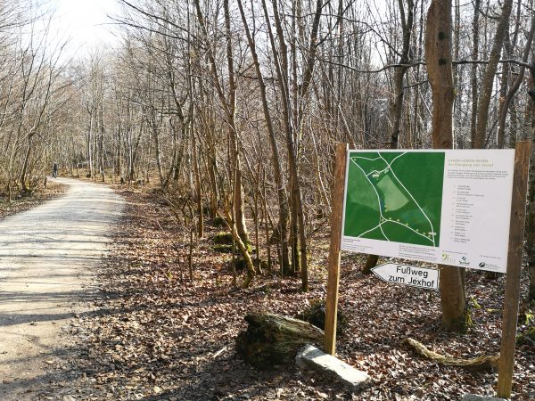 Ausgangspunkt unserer kleinen Scootertour ist der „Untere Parkplatz“ an der gleichnamigen Bushaltestelle. Von hier aus folgen wir dem Klangweg, der als Fußweg zum Jexhof ausgeschildert ist.