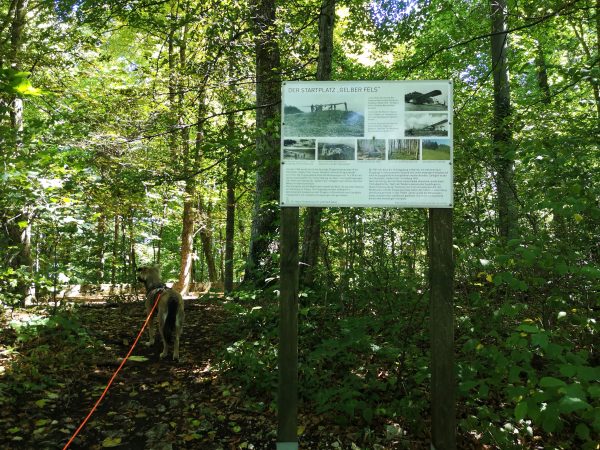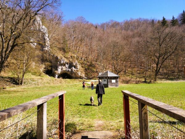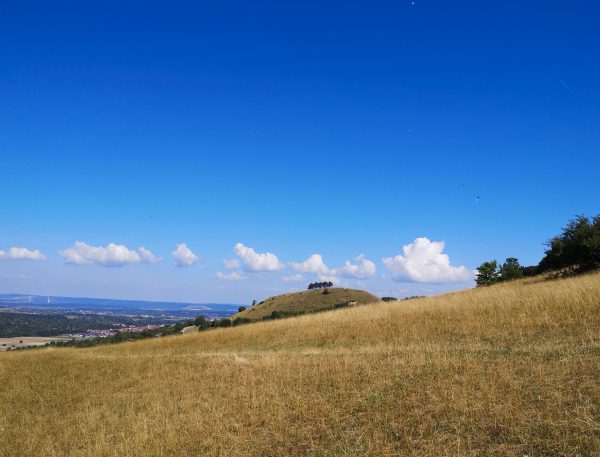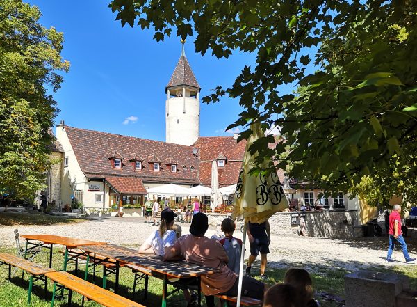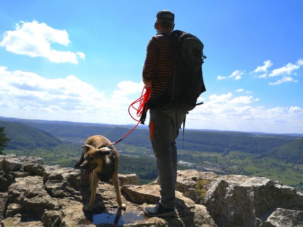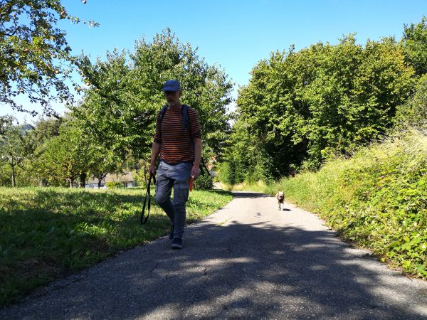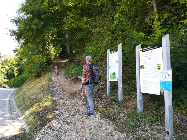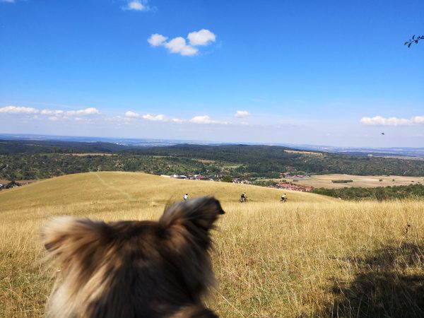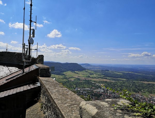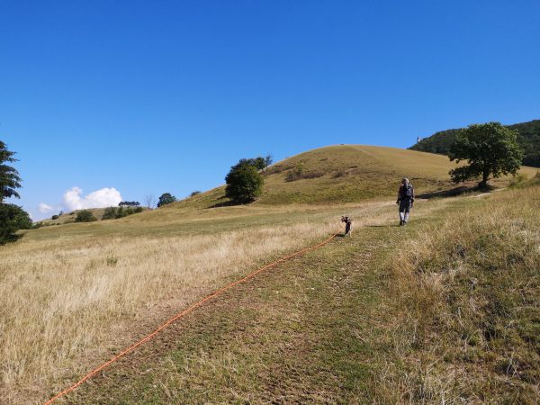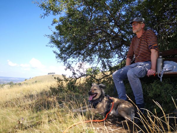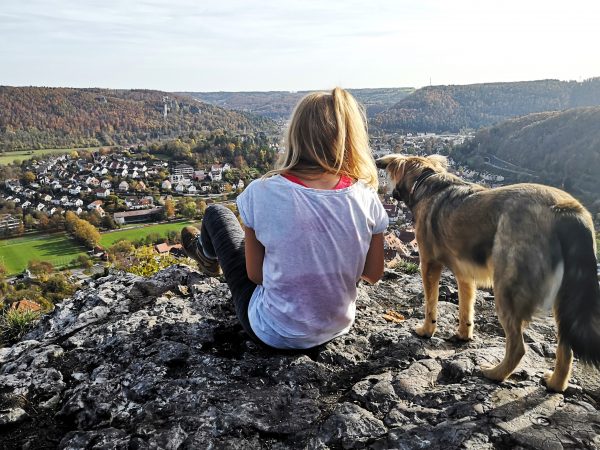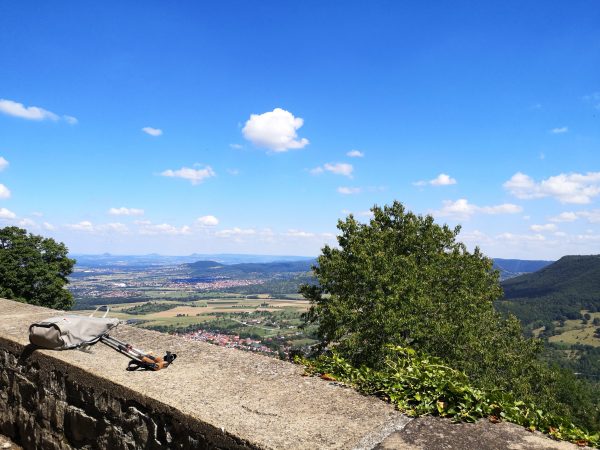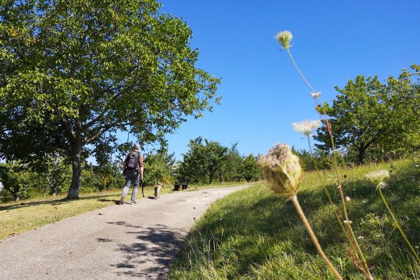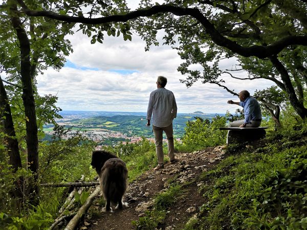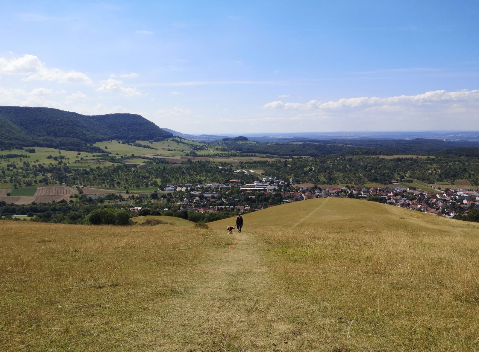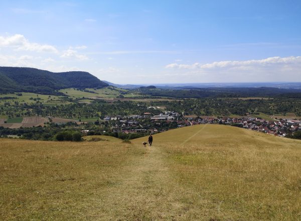 Am Albtrauf über dem Tal der Lauter thront die Burg Teck auf dem gleichnamigen Berg. Die Burg, liebevoll restauriert, lockt mit einer Super-Aussicht und einem lässigen Biergarten. Hier kann man wunderbar die Zeit verstreichen lassen, während sich der Vierbeiner unter Bäumen auf der Wiese lang macht. Hinauf und hinab laufen wir zunächst über offene Wiesen (Schafweiden) mit Weitblick, dann durch Wald. Bevor wir den Biergarten auf der Burg entern, machen wir noch einen Abstecher zum Aussichtspunkt „Gelber Fels“. In den 193oer Jahren starteten hier Segelflieger. Und noch immer fliegt der Blick fliegt von hier weit über die Schwäbische Alb. Wunderschön an einem klaren Tag.