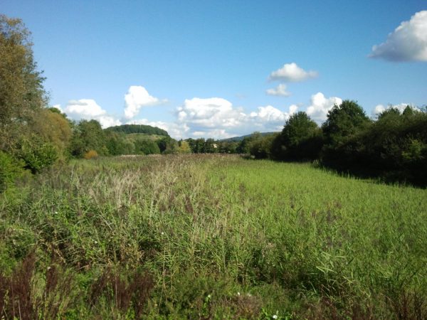 Jetzt vermissen wir eine Weile die sonst vorbildliche Wegweisung, bis wir –nun auf einem Betonweg- die Häfnerhaslacher Straße erreichen. Hier geht es rechts auf einen Grasweg entlang der Straße. Dann überqueren wir diese und verlassen die Straße wieder. Rechts unten fließt ein Bach, wir gehen am Ausläufer des (280 m hohen!) Vogtberges entlang.