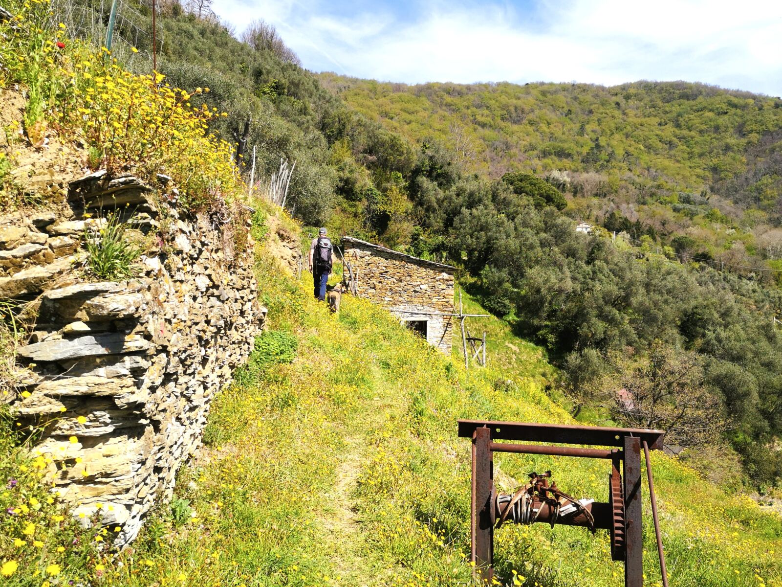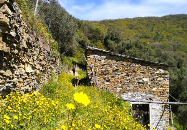 Wir folgen dem Wanderweg immer weiter bergauf, kreuzen die Via Sorlana und gelangen auf unserem Wanderweg zur Chiesa di Santa Maria Asunta. Nach einer kurzen Rast mit schönem Weitblick über die Hügel, die Dörfer und das Meer geht es weiter auf dem Wanderweg. Er bringt uns durch altes Bauernland, vorbei an Trockenmauern, alten Steinschuppen und Blumenwiesen. Dann laufen wir durch lichten Wald weiter bergauf.