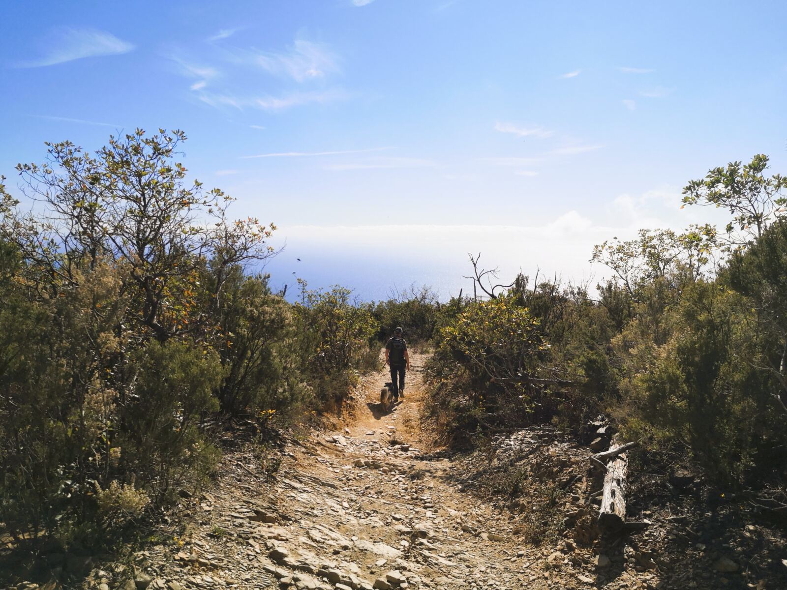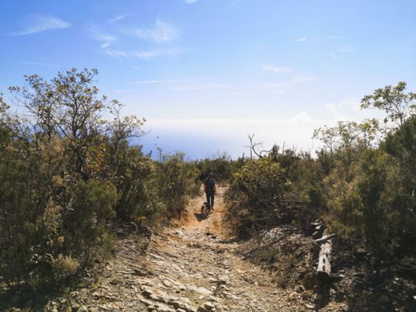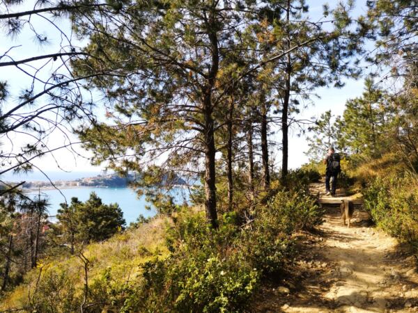 Über einen ausgewaschenen sandig-steinigen Pfad geht es durch den Wald bergab. Schließlich öffnet sich der Blick. Wir sehen jetzt unter uns immer wieder das Meer. Mal auf einem Fußweg, mal auf einem Montainbike-Trail geht es weiter bergab. Schließlich stößt unser Wanderweg auf den Pfad zur Chiesa di Sant’Anna. Wir halten uns links und nehmen den direkten Weg hinab zum Campingplatz.