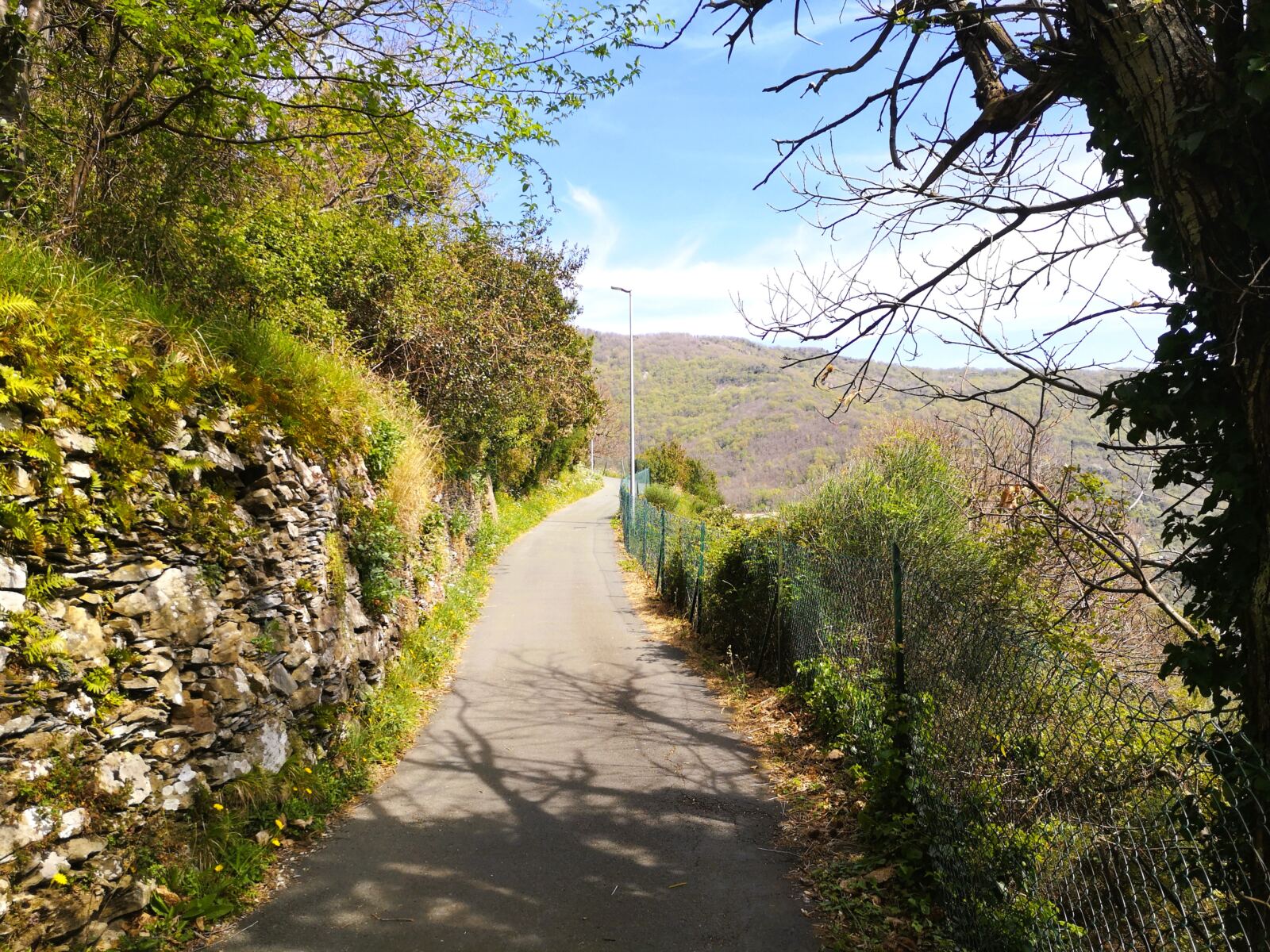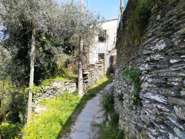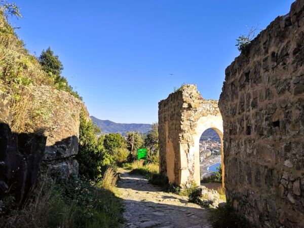 Wir genießen den Blick von der Ruine, folgen dann weiter dem Wanderweg, der alten Strada di Rooche di Sant’Anna mit Weitblick über die Küstenlinie. Wir erreichen die ersten Häuser von Cavi di Lavagna. Auf der Teerstraße gehen wir wenige Meter bergab, biegen dann rechts von der Straße auf den Wanderweg ab, der uns durch kühlen Wald weiter bergab führt.