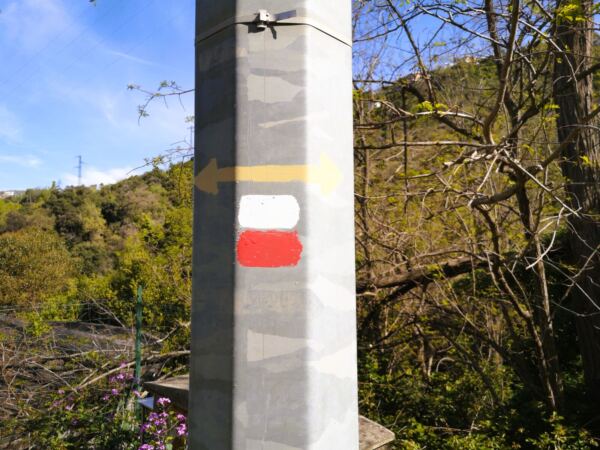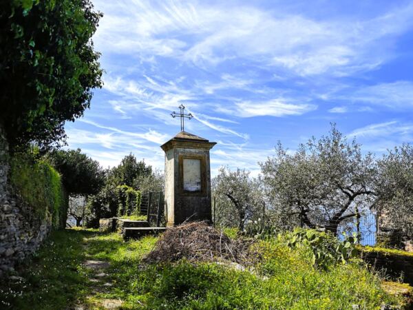 Nach einer kurzen Rast gehen wir – das Meer im Rücken – links an der Kirche vorbei. Hinter einem Denkmal startet ein markierter Wanderweg. Wir folgen dem Weg, halten uns an der nächsten Gabelung rechts. Zwischen zwei Gebäuden steigen wir hinab, gelangen auf die Via alla Chiesa, der wir nur einige Schritte folgen. Vor einem Haus zweigt scharf rechts der Wanderweg ab.