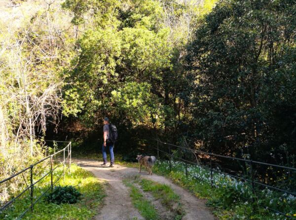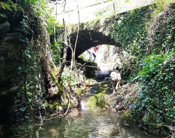 Der kleine Pfad durch die terrassierten Hänge mündet bald schon auf ein kleines Sträßchen. Wir folgen ihm immer geradeaus, halten uns an der nächsten Gabelung links und gelangen wieder auf einen Wanderweg. Der Weg mündet wieder auf die Straße Richtung Crocetta. Wir laufen in Richtung des Weilers, bis wir kurz vor dem Ortseingang rechts auf den Wanderweg wechseln können. Er bringt uns auf die Via Senaxi. Dieser folgen wir Richtung Sorlana. Bei nächster Gelegenheit biegen wir auf den Wanderweg ab, der rechts von der Straße abzweigt. Zwischen Trockenmauern laufen wir unterhalb der Straße, überqueren den Rio Barassi über eine Brücke – und gönnen unserem Amos eine ausgiebige Planschpause.