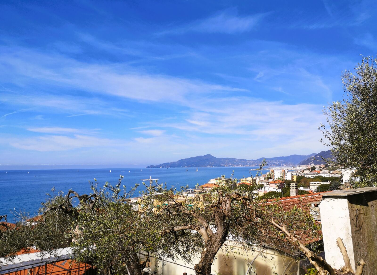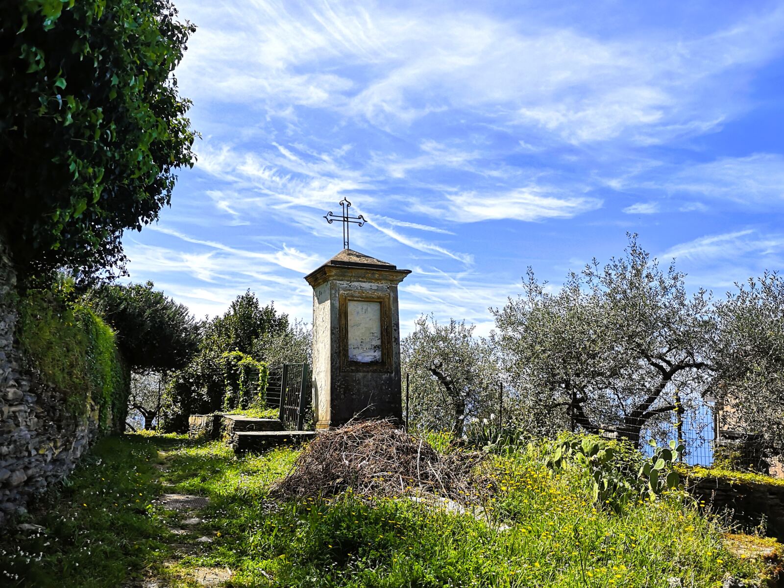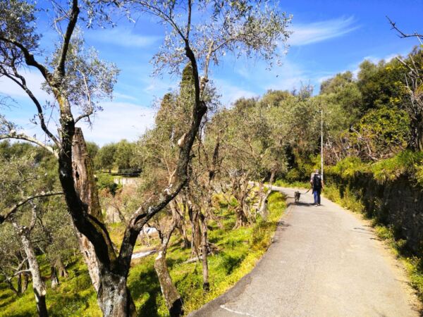 Wir erreichen den Badeort Cavi. Wir laufen geradeaus auf der Via Brigate Partigiane an Geschäften und einer kleinen Kirche vorbei. Die Straße mündet auf die Hauptstraße. Wir folgen ihr bergauf und weiter auf der schmaleren Via antica Romana vorbei an der Pfarrkirche SS. Concezione. Auf der Via antica Romana laufen wir weiter bergauf. Schließlich schwingt sich rechts an der Straße eine Treppe im Mauerwerk hinauff. Wir folgen ihr – und laufen dann auf einem schönen Wiesenweg zwischen Olivenhainen und Mauern recht steil bergauf.